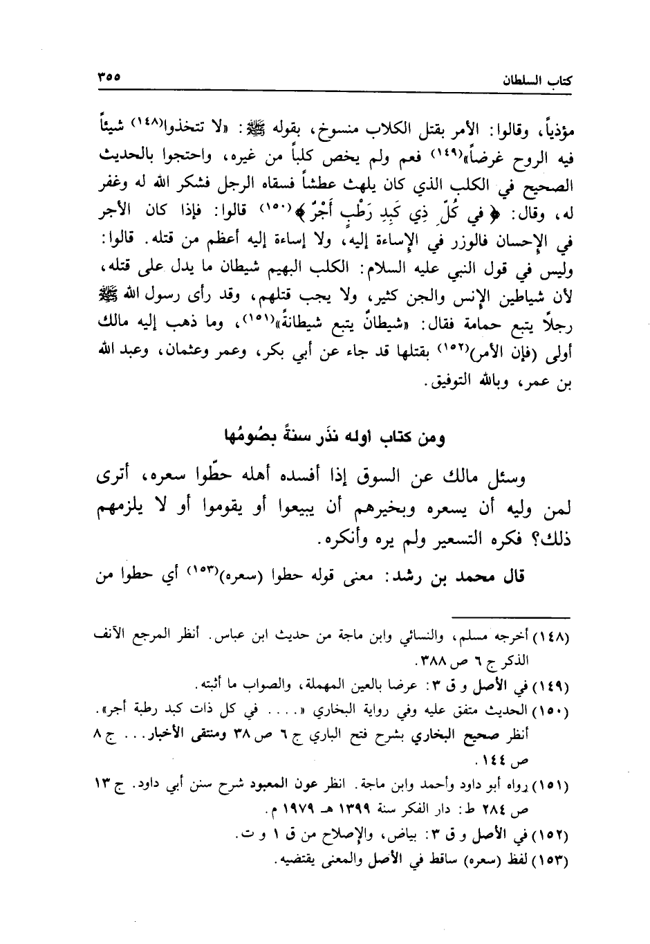 مؤذيا، وقالوا: الأمر بقتل الكلاب منسوخ، بقوله - صَلَّى اللَّهُ عَلَيْهِ وَسَلَّمَ -: «لا تتخذوا شيئا فيه الروح غرضا» فعم ولم يخص كلبا من غيره، واحتجوا بالحديث الصحيح في الكلب الذي كان يلهث عطشا، فسقاه الرجل فشكر الله له وغفر له، وقال: «في كل ذي كبد رطب أجر» قالوا: فإذا كان الأجر في الإحسان، فالوزر في الإساءة إليه، ولا إساءة إليه أعظم من قتله. قالوا: وليس في قول النبي - عَلَيْهِ السَّلَامُ -: «الكلب البهيم شيطان» ما يدل على قتله؛ لأن شياطين الإنس والجن كثير، ولا يجب قتلهم، وقد رأى رسول الله - صَلَّى اللَّهُ عَلَيْهِ وَسَلَّمَ - رجلا يتبع حمامة فقال: «شيطان يتبع شيطانة» ، وما ذهب إليه مالك أولى، فإن الأمر بقتلها قد جاء عن أبي بكر، وعمر، وعثمان، وعبد الله بن عمر، وبالله التوفيق.