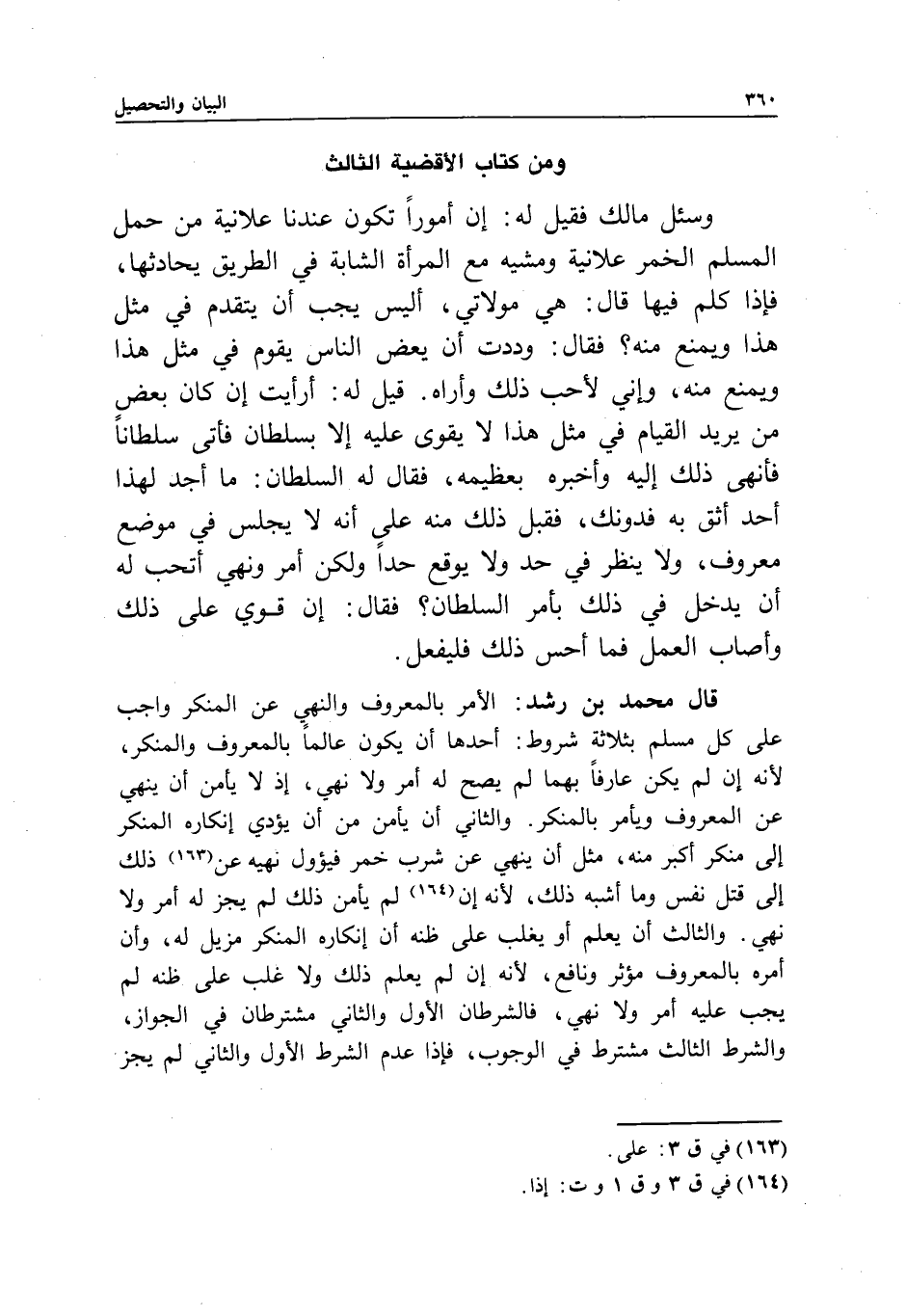 قال محمد بن رشد: الأمر بالمعروف والنهي عن المنكر واجب على كل مسلم بثلاثة شروط؛ أحدها: أن يكون عالما بالمعروف والمنكر؛ لأنه إن لم يكن عارفا بهما لم يصح له أمر ولا نهي؛ إذ لا يأمن أن ينهى عن المعروف ويأمر بالمنكر. والثاني: أن يأمن من أن يؤدي إنكاره المنكر إلى منكر أكبر منه، مثل أن ينهى عن شرب خمر فيئول نهيه عن ذلك إلى قتل نفس وما أشبه ذلك؛ لأنه إن لم يأمن ذلك لم يجز له أمر ولا نهي.