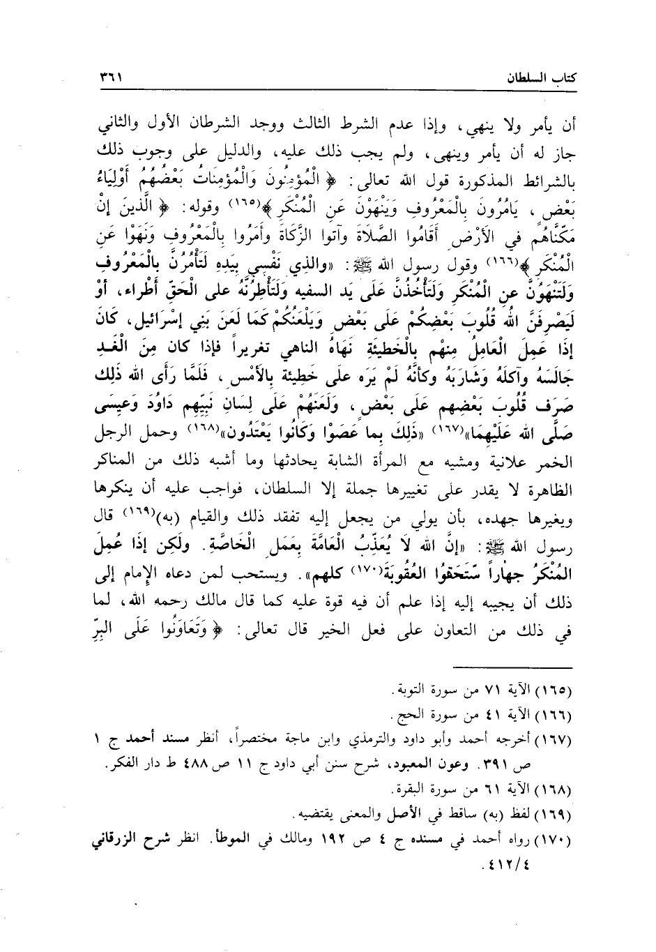 أن يأمر ولا ينهى، وإذا عدم الشرط الثالث ووجد الشرطان الأول والثاني جاز له أن يأمر وينهى، ولم يجب ذلك عليه، والدليل على وجوب ذلك بالشرائط المذكورة قول الله تعالى: {وَالْمُؤْمِنُونَ وَالْمُؤْمِنَاتُ بَعْضُهُمْ أَوْلِيَاءُ بَعْضٍ يَأْمُرُونَ بِالْمَعْرُوفِ وَيَنْهَوْنَ عَنِ الْمُنْكَرِ} [التوبة: 71] ، وقوله: {الَّذِينَ إِنْ مَكَّنَّاهُمْ فِي الأَرْضِ أَقَامُوا الصَّلاةَ وَآتَوُا الزَّكَاةَ وَأَمَرُوا بِالْمَعْرُوفِ وَنَهَوْا عَنِ الْمُنْكَرِ} [الحج: 41] ، وقول رسول الله - صَلَّى اللَّهُ عَلَيْهِ وَسَلَّمَ -: «والذي نفسي بيده، لتأمرن بالمعروف، ولتنهون عن المنكر، ولتأخذن على يد السفيه، ولتأطرنه على الحق أطرا، أو ليصرفن الله قلوب بعضكم على بعض، ويلعنكم كما لعن بني إسرائيل، كان إذا عمل العامل منهم بالخطيئة نهاه الناهي تغريرا، فإذا كان من الغد جالسه وآكله وشاربه، وكأنه لم يره على خطيئة بالأمس، فلما رأى الله ذلك صرف قلوب بعضهم على بعض، ولعنهم على لسان نبيهم داود وعيسى صلى الله عليهما {ذَلِكَ بِمَا عَصَوْا وَكَانُوا يَعْتَدُونَ} [المائدة: 78] » وحمل الرجل الخمر علانية ومشيه مع المرأة الشابة يحادثها وما أشبه ذلك من المناكر الظاهرة، لا يقدر عنى تغييرها جملة إلا السلطان، فواجب عليه أن ينكرها ويغيرها جهده، بأن يولي من يجعل إليه تفقد ذلك والقيام به، قال رسول الله - صَلَّى اللَّهُ عَلَيْهِ وَسَلَّمَ -: «إن الله لا يعذب العامة بعمل الخاصة، ولكن إذا عمل المنكر جهارا استحقوا العقوبة كلهم» . ويستحب لمن دعاه الإمام إلى ذلك أن يجيبه إليه إذا علم أن فيه قوة عليه كما قال مالك - رَحِمَهُ اللَّهُ -؛ لما في ذلك من التعاون على فعل الخير، قال تعالى: {وَتَعَاوَنُوا عَلَى الْبِرِّ وَالتَّقْوَى وَلا تَعَاوَنُوا عَلَى الإِثْمِ وَالْعُدْوَانِ} [المائدة: 2]