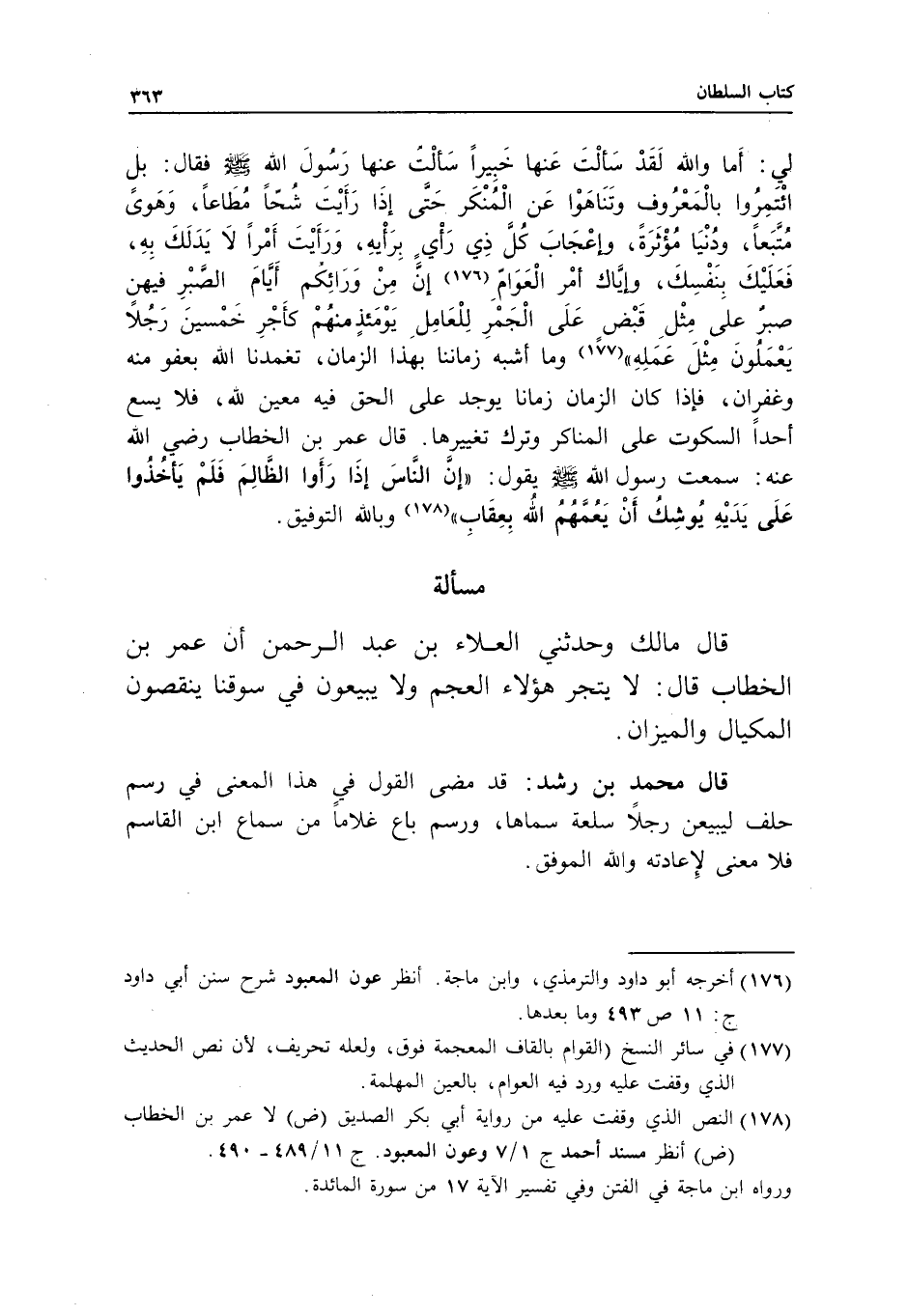 لي: أما والله، لقد سألت عنها خبيرا، سألت عنها رسول الله - صَلَّى اللَّهُ عَلَيْهِ وَسَلَّمَ - فقال: بل ائتمروا بالمعروف، وتناهوا عن المنكر حتى إذا رأيت شحا مطاعا، وهوى متبعا، ودنيا مؤثرة، وإعجاب كل ذي رأي برأيه، ورأيت أمرا لا يدلك به، فعليك بنفسك، وإياك أمر العوام، إن من ورائكم أيام الصبر فيهن صبر على مثل قبض على الجمر، للعامل يومئذ منهم كأجر خمسين رجلا يعملون مثل عمله» ، وما أشبه زماننا بهذا الزمان، تغمدنا الله بعفو منه وغفران، فإذا كان الزمان زمانا يوجد على الحق فيه معين لله، فلا يسع أحدا السكوت على المناكر وترك تغييرها، قال عمر بن الخطاب - رَضِيَ اللَّهُ عَنْهُ -: سمعت رسول الله - صَلَّى اللَّهُ عَلَيْهِ وَسَلَّمَ - يقول: «إن الناس إذا رأوا الظالم، فلم يأخذوا على يديه، يوشك أن يعمهم الله بعقاب» ، وبالله التوفيق.