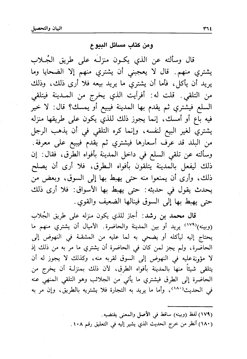 قال محمد بن رشد: أجاز للذي يكون منزله على طريق الجلاب وبينه، يريد أو بين المدينة والحاضرة. الأميال أن يشتري منهم ما يحتاج إليه ليأكله أو يضحي به؛ لما عليه من المشقة في النهوض إلى الحاضرة، ولم يجز لمن كان في الحاضرة أن يشتري ما مر به من ذلك؛ إذ لا مئونة عليه في النهوض إلى السوق لقربه منه، وكذلك لا يجوز له أن يتلقى شيئا منها بالمدينة بأفواه الطرق؛ لأن ذلك بمنزلة أن يخرج من الحاضرة إلى الطرق، فيشتري ما يأتي من الجلائب وهو التلقي المنهي عنه في الحديث.