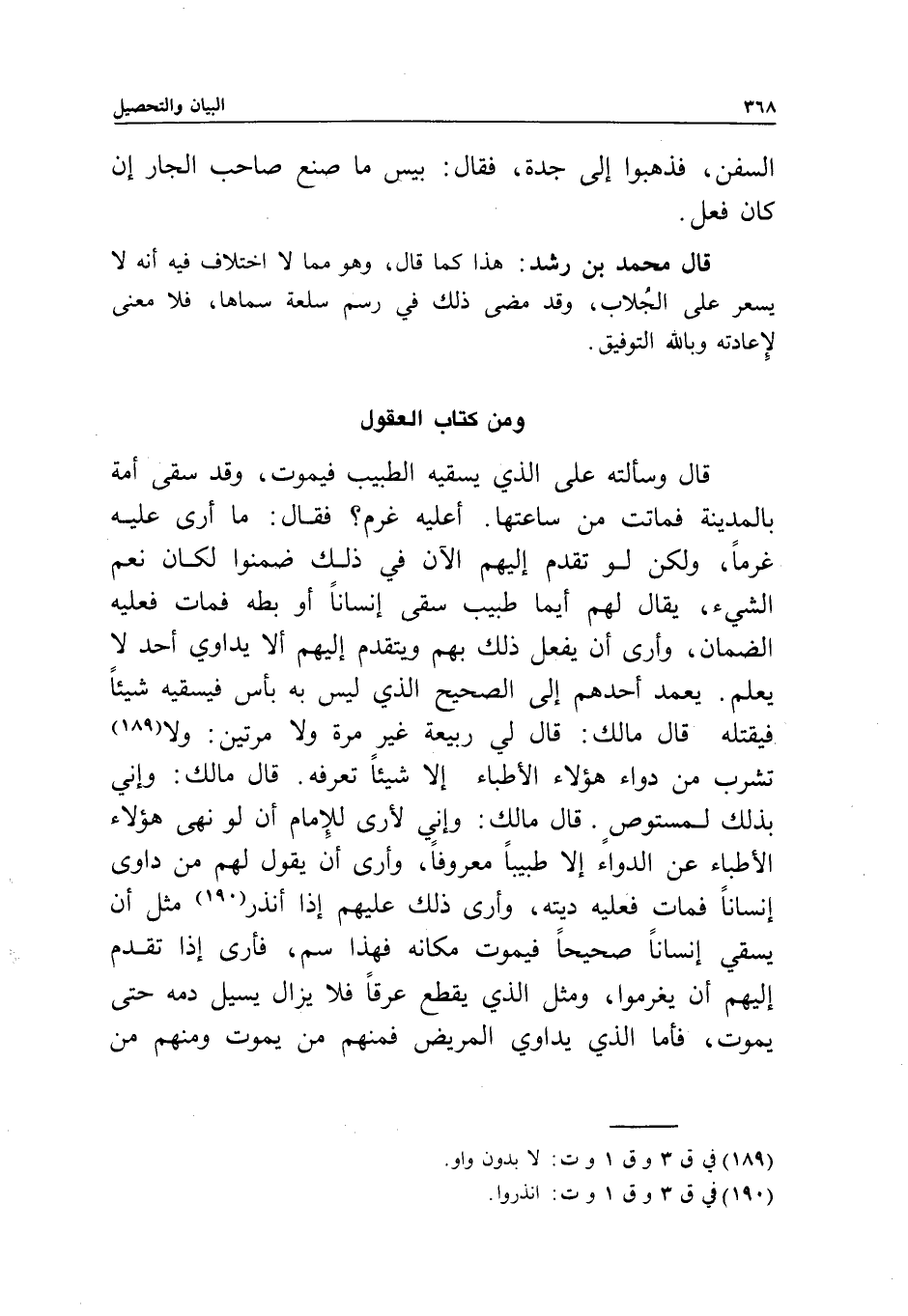 ومن كتاب العقول قال: وسألته على الذي يسقيه الطبيب فيموت، وقد سقى أمة بالمدينة، فماتت من ساعتها، أعليه غرم؟ فقال: ما أرى عليه غرما، ولكن لو تقدم إليهم الآن في ذلك ضمنوا؛ لكان نعم الشيء، يقال لهم: أيما طبيب سقى إنسانا أو بطة فمات فعليه الضمان، وأرى أن يفعل ذلك بهم، ويتقدم إليهم ألا يداوي أحد لا يعلم، يعمد أحدهم إلى الصحيح الذي ليس به بأس فيسقيه شيئا فيقتله، قال مالك: قال لي ربيعة غير مرة ولا مرتين: ولا تشرب من دواء هؤلاء الأطباء إلا شيئا تعرفه. قال مالك: وإني بذلك لمستوص. قال مالك: وإني لأرى للإمام أن لو نهى هؤلاء الأطباء عن الدواء إلا طبيبا معروفا، وأرى أن يقول لهم: من داوى إنسانا فمات فعليه ديته، وأرى ذلك عليهم إذا أنذر مثل أن يسقي إنسانا صحيحا فيموت مكانه فهذا سم، فأرى إذا تقدم إليهم أن يغرموا، ومثل الذي يقطع عرقا، فلا يزال يسيل دمه حتى يموت، فأما الذي يداوي المريض؛ فمنهم من يموت، ومنهم من