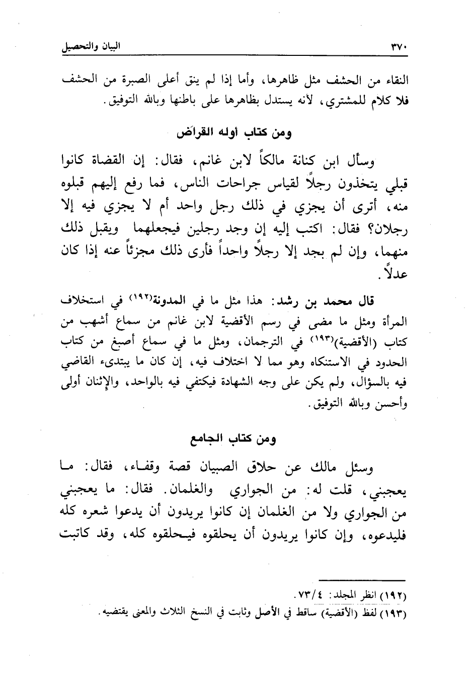 ومن كتاب أوله القراض وسأل ابن كنانة مالكا لابن غانم، فقال: إن القضاة كانوا قبلي يتخذون رجلا لقياس جراحات الناس، فما رفع إليهم قبلوه منه، أترى أن يجزي في ذلك رجل واحد، أم لا يجزي فيه إلا رجلان؟ فقال: اكتب إليه إن وجد رجلين فيجعلهما، ويقبل ذلك منهما، وإن لم يجد إلا رجلا واحدا، فأرى ذلك مجزئا عنه إذا كان عدلا.