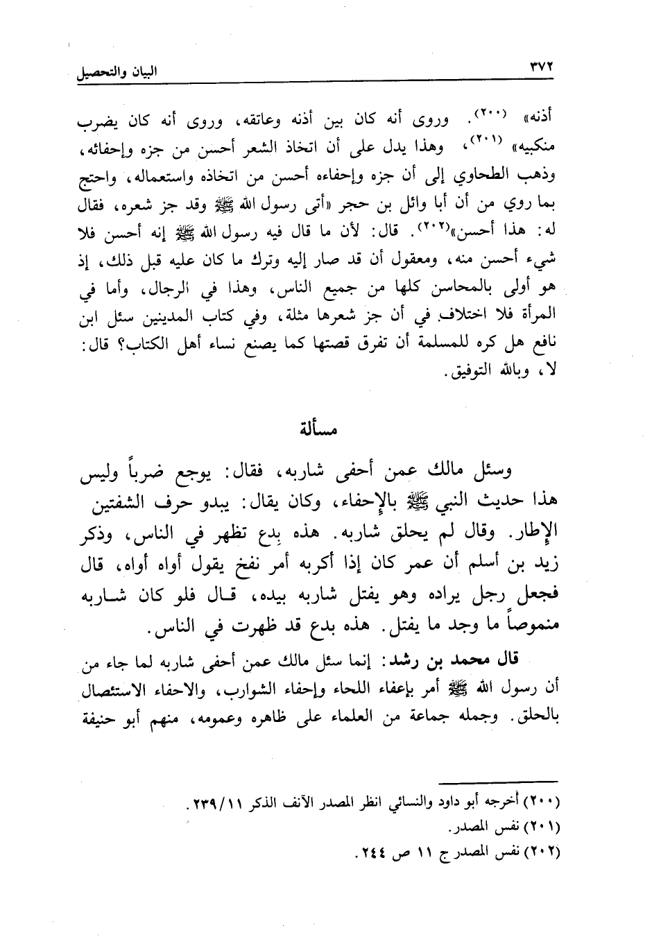 قال محمد بن رشد: إنما سئل مالك عمن أحفى شاربه لما جاء من «أن رسول الله - صَلَّى اللَّهُ عَلَيْهِ وَسَلَّمَ - أمر بإعفاء اللحاء، وإحفاء الشوارب» ، والإحفاء الاستئصال بالحلق. وجمله جماعة من العلماء على ظاهره وعمومه، منهم أبو حنيفة