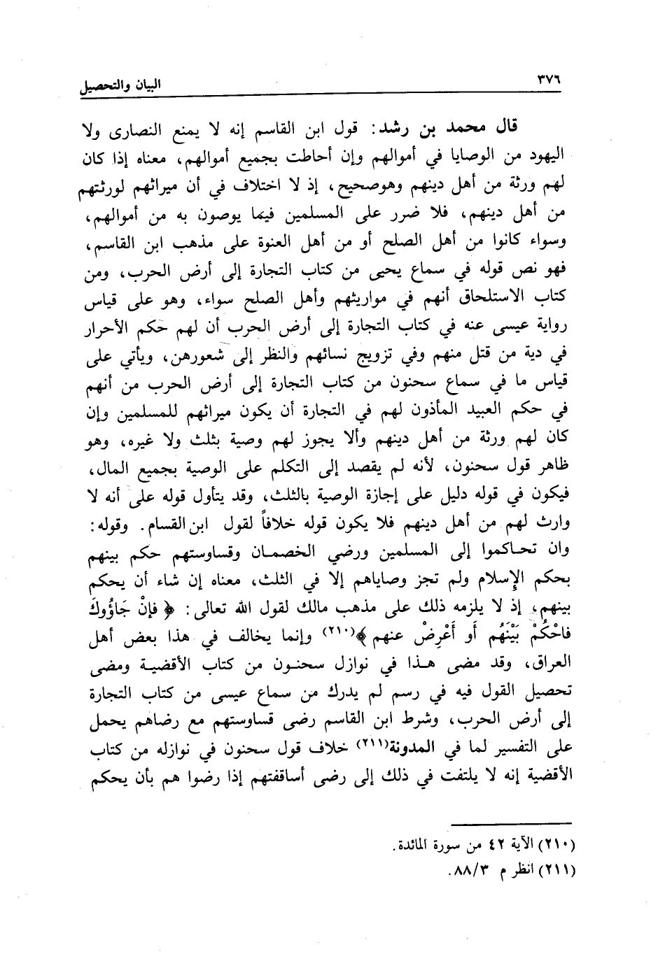قال محمد بن رشد: قول ابن القاسم: إنه لا يمنع النصارى ولا اليهود من الوصايا في أموالهم، وإن أحاطت بجميع أموالهم، معناه إذا كان لهم ورثة من أهل دينهم، وهو صحيح؛ إذ لا اختلاف في أن ميراثهم لورثتهم من أهل دينهم، فلا ضرر على المسلمين فيما يوصون به من أموالهم، وسواء كانوا من أهل الصلح أو من أهل العنوة على مذهب ابن القاسم، فهو نص قوله في سماع يحيى من كتاب التجارة إلى أرض الحرب، ومن كتاب الاستلحاق أنهم في مواريثهم، وأهل الصلح سواء، وهو على قياس رواية عيسى عنه في كتاب التجارة إلى أرض الحرب أن لهم حكم الأحرار في دية من قتل منهم، وفي تزويج نسائهم والنظر إلى شعورهن، ويأتي على قياس ما في سماع سحنون من كتاب التجارة إلى أرض الحرب، من أنهم في حكم العبيد المأذون لهم في التجارة أن يكون ميراثهم للمسلمين، وإن كان لهم ورثة من أهل دينهم، وألا يجوز لهم وصية بثلث ولا غيره، وهو ظاهر قول سحنون؛ لأنه لم يقصد إلى التكلم على الوصية بجميع المال، فيكون في قوله دليل على إجازة الوصية بالثلث، وقد يتأول قوله على أنه لا وارث لهم من أهل دينهم، فلا يكون قوله خلافا لقول ابن القاسم.