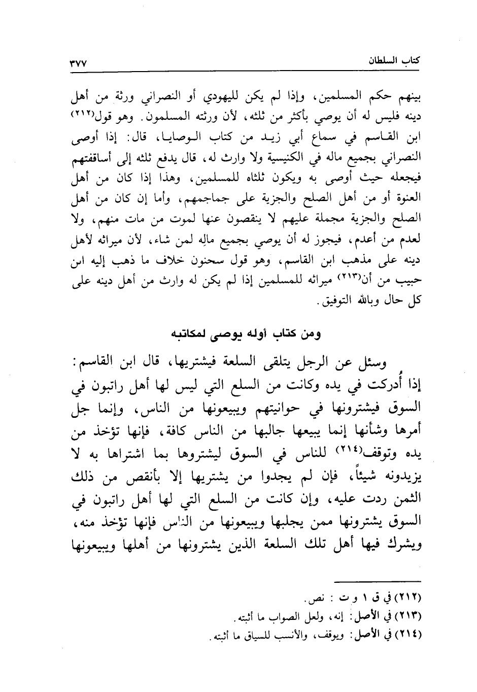 بينهم حكم المسلمين، وإذا لم يكن لليهودي أو النصراني ورثة من أهل دينه، فليس له أن يوصي بأكثر من ثلثه؛ لأن ورثته المسلمون. وهو قول ابن القاسم في سماع أبي زيد من كتاب الوصايا، قال: إذا أوصى النصراني بجميع ماله في الكنيسية ولا وارث له، قال: يدفع ثلثه إلى أساقفتهم، فيجعله حيث أوصى به، ويكون ثلثاه للمسلمين، وهذا إذا كان من أهل العنوة، أو من أهل الصلح والجزية على جماجمهم، وأما إن كان من أهل الصلح والجزية مجملة عليهم لا ينقصون عنها لموت من مات منهم، ولا لعدم من أعدم، فيجوز له أن يوصي بجميع ماله لمن شاء؛ لأن ميراثه لأهل دينه على مذهب ابن القاسم، وهو قول سحنون خلاف ما ذهب إليه ابن حبيب من أن ميراثه للمسلمين إذا لم يكن له وارث من أهل دينه على كل حال، وبالله التوفيق.