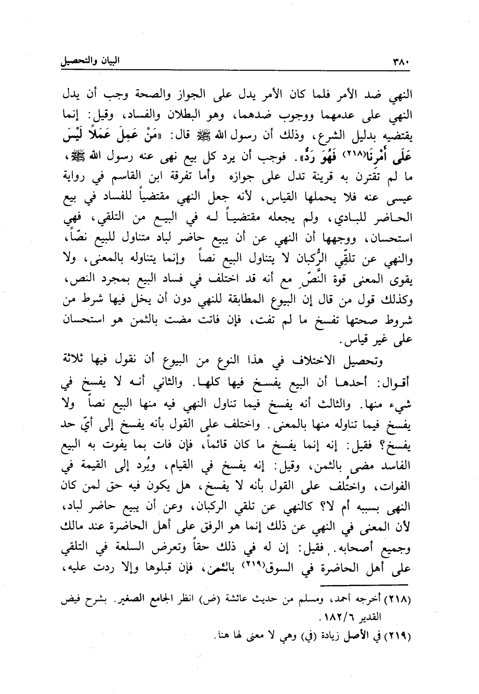 النهي ضد الأمر، فلما كان الأمر يدل على الجواز والصحة، وجب أن يدل النهي على عدمهما ووجوب ضدهما، وهو البطلان والفساد، وقيل: إنما يقتضيه بدليل الشرع، وذلك أن رسول الله - صَلَّى اللَّهُ عَلَيْهِ وَسَلَّمَ - قال: «من عمل عملا ليس على أمرنا فهو رد» . فوجب أن يرد كل بيع نهى عنه رسول الله - صَلَّى اللَّهُ عَلَيْهِ وَسَلَّمَ -، ما لم تقترن به قرينة تدل على جوازه، وأما تفرقة ابن القاسم في رواية عيسى عنه، فلا يحملها القياس؛ لأنه جعل النهي مقتضيا للفساد في بيع الحاضر للبادي، ولم يجعله مقتضيا له في البيع من التلقي، فهي استحسان، ووجهها أن النهي عن أن يبيع حاضر لباد متناول للبيع نصا، والنهي عن تلقي الركبان لا يتناول البيع نصا، وإنما يتناوله بالمعنى، ولا يقوى المعنى قوة النص، مع أنه قد اختلف في فساد البيع بمجرد النص، وكذلك قول من قال: إن البيوع المطابقة للنهي دون أن يخل فيها شرط من شروط صحتها تفسخ ما لم تفت، فإن فاتت مضت بالثمن هو استحسان على غير قياس.