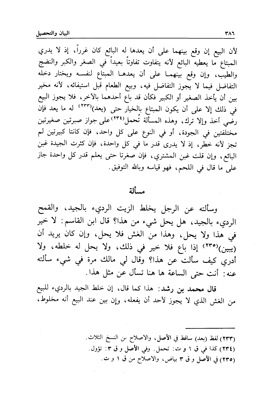مسألة وسألته: عن الرجل يخلط الزيت الرديء بالجيد، والقمح الرديء بالجيد، هل يحل شيء من هذا؟ قال ابن القاسم: لا خير في هذا ولا يحل، وهذا من الغش فلا يحل، وإن كان يريد أن (يبين) إذا باع فلا خير في ذلك، ولا يحل له خلطه، ولا أدري كيف سألت عن هذا؟ وقال لي مالك مرة في شيء سألته عنه: أنت حتى الساعة هاهنا تسأل عن مثل هذا.