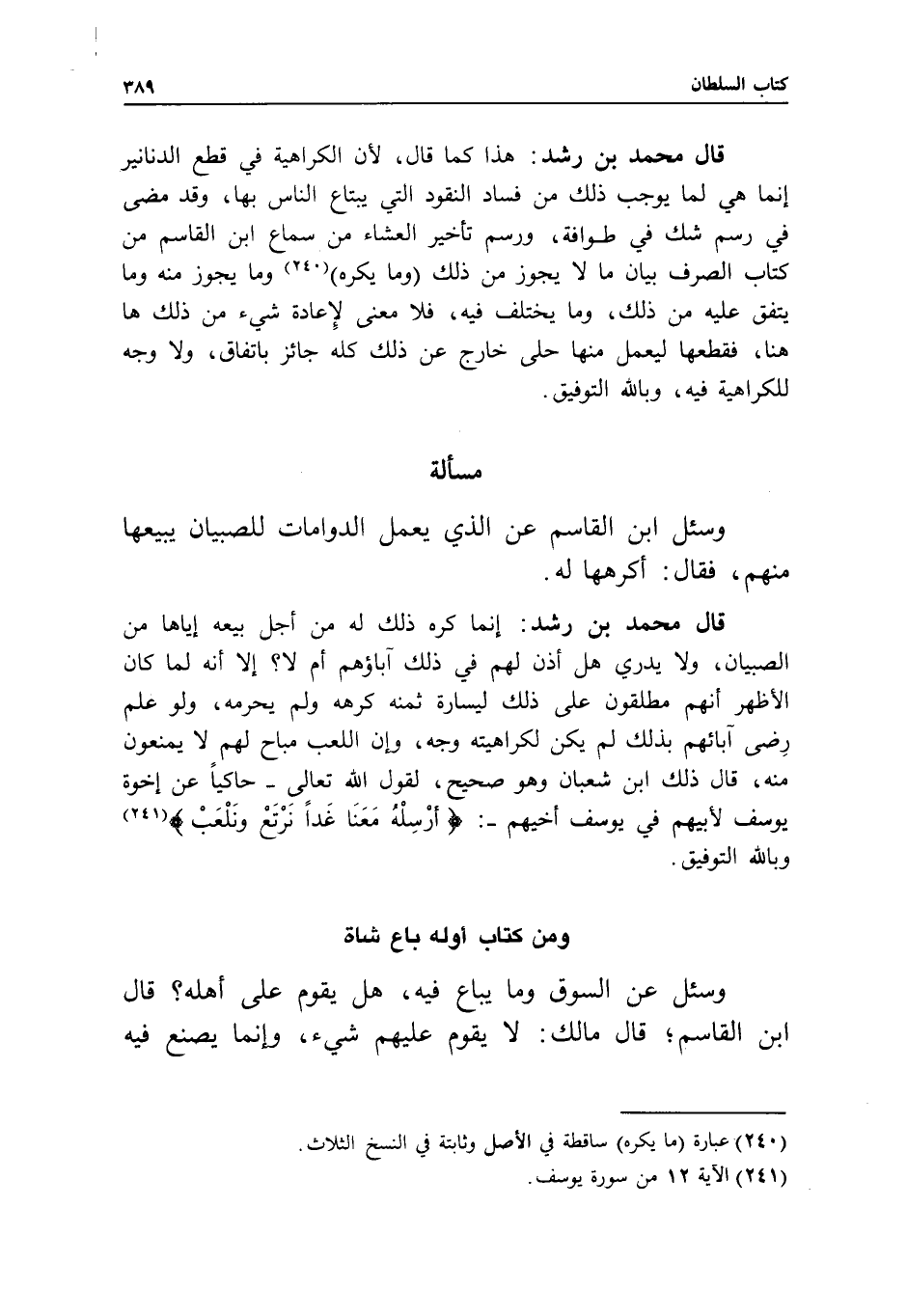 قال محمد بن رشد: إنما كره ذلك له من أجل بيعه إياها من الصبيان، ولا يدري هل أذن لهم في ذلك آباؤهم أم لا؟ إلا أنه لما كان الأظهر أنهم مطلقون على ذلك ليسارة ثمنه، كرهه ولم يحرمه، ولو علم رضا آبائهم بذلك لم يكن لكراهيته وجه، وإن اللعب مباح لهم لا يمنعون منه، قال ذلك ابن شعبان وهو صحيح، لقول الله تعالى، حاكيا عن إخوة يوسف لأبيهم في يوسف أخيهم: (أرسله معنا غدا نرتع ونلعب) ، وبالله التوفيق.
