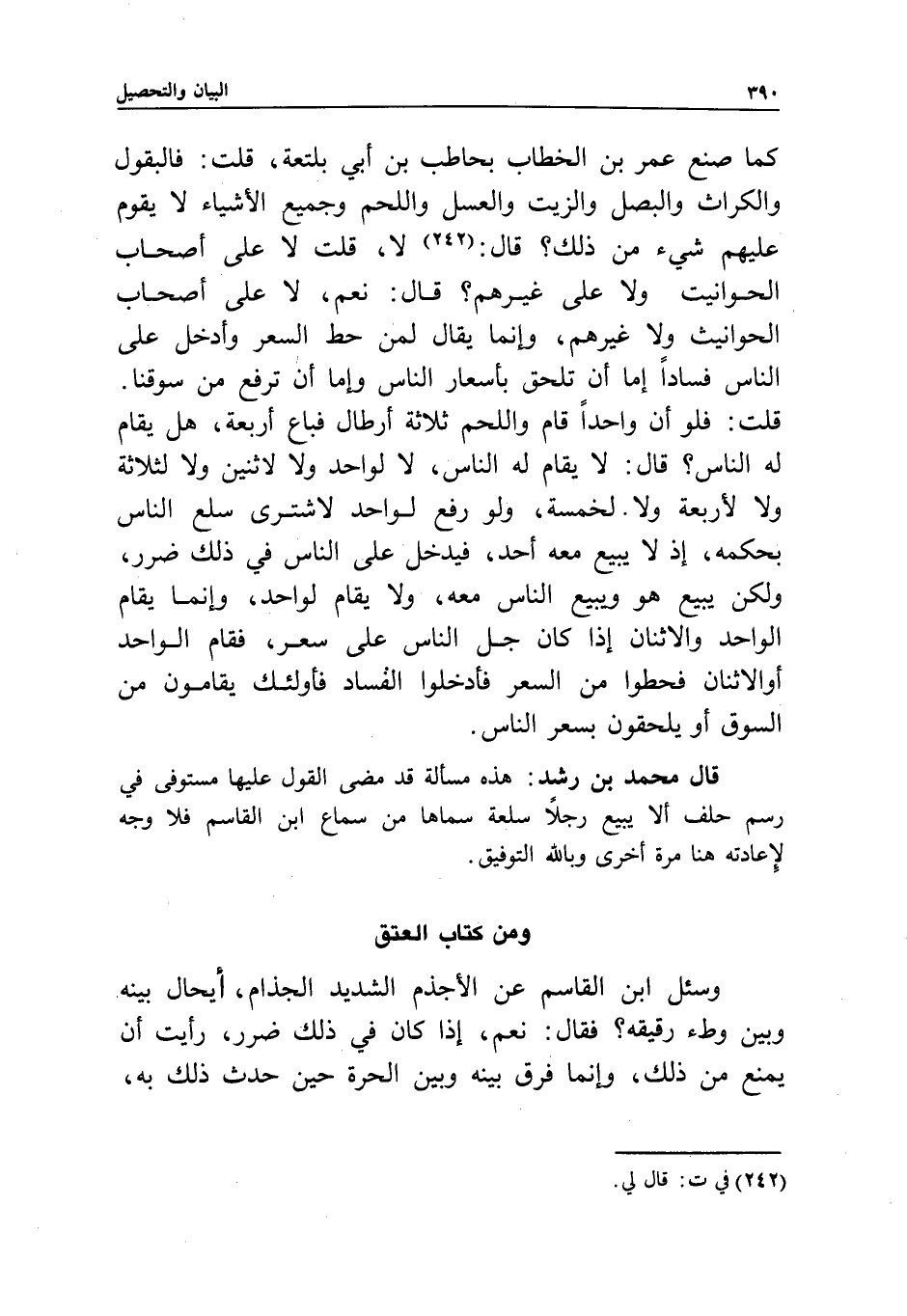 كما صنع عمر بن الخطاب بحاطب بن أبي بلتعة، قلت: فالبقول والكراث والبصل والزيت والعسل واللحم وجميع الأشياء لا يقوم عليهم شيء من ذلك؟ قال: لا، قلت: لا على أصحاب الحوانيت ولا على غيرهم؟ قال: نعم، لا على أصحاب الحوانيت ولا غيرهم، وإنما يقال لمن حط السعر وأدخل على الناس فسادا: إما أن تلحق بأسعار الناس وإما أن ترفع من سوقنا.