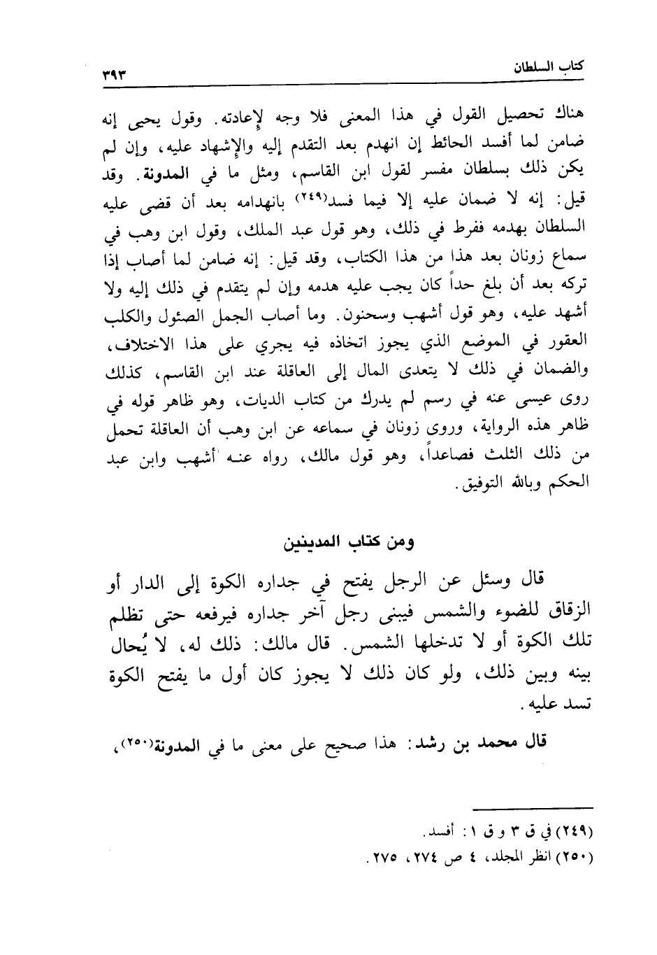 وقول يحيى إنه ضامن لما أفسد الحائط إن انهدم بعد التقدم إليه والإشهاد عليه، وإن لم يكن ذلك بسلطان مفسر لقول ابن القاسم، ومثل ما في المدونة.