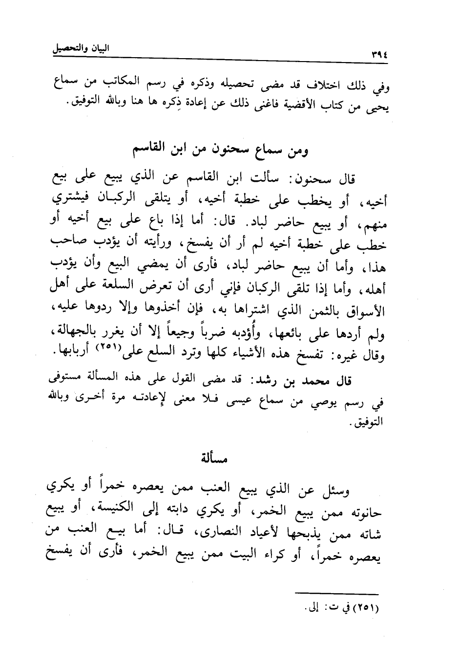 مسألة وسئل: عن الذي يبيع العنب ممن يعصره خمرا أو يكري حانوته ممن يبيع الخمر، أو يكري دابته إلى الكنيسة، أو يبيع شاته ممن يذبحها لأعياد النصارى، قال: أما بيع العنب من يعصره خمرا، أو كراء البيت ممن يبيع الخمر، فأرى أن يفسخ