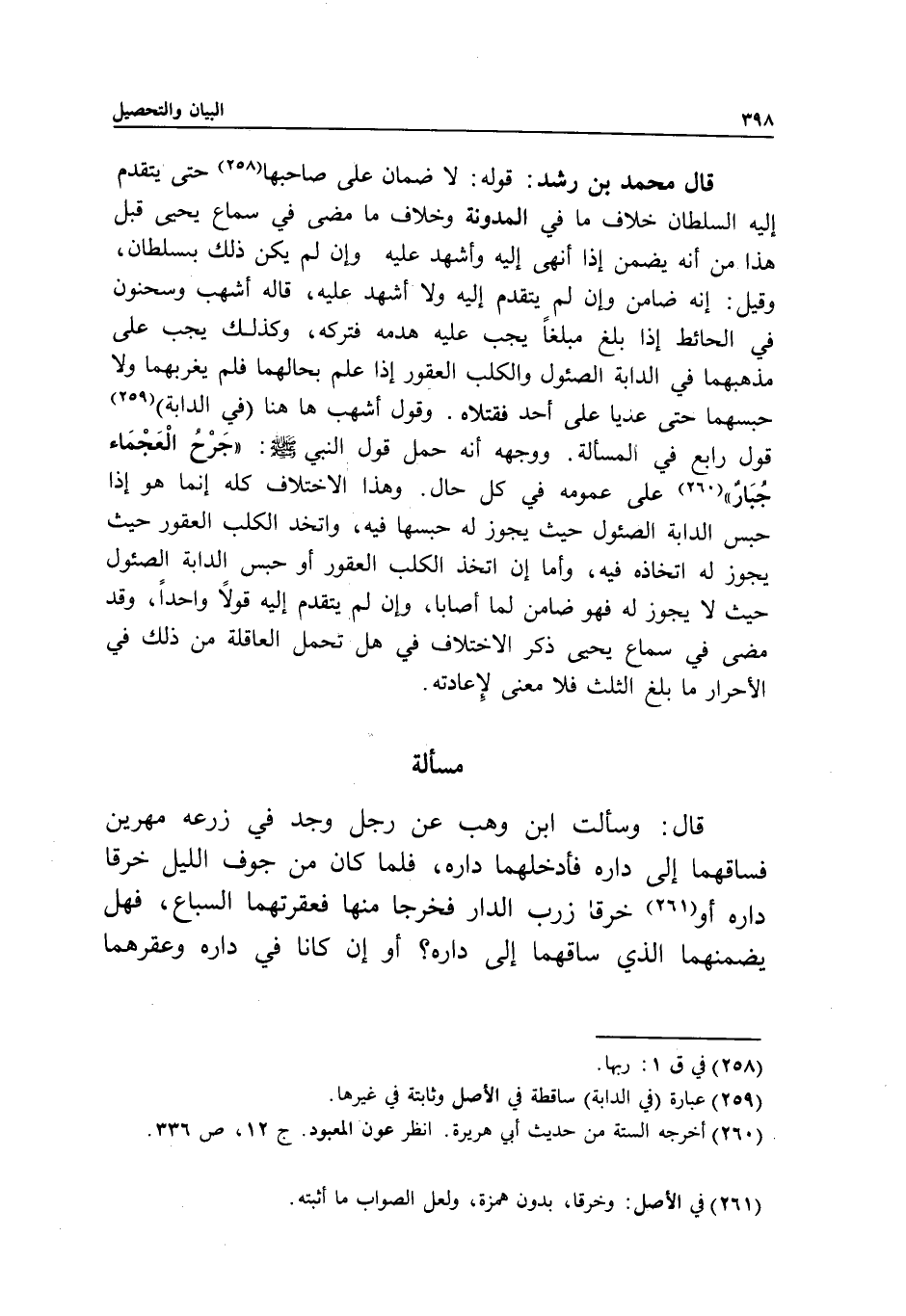 قال محمد بن رشد: قوله: لا ضمان على صاحبها حتى يتقدم إليه السلطان خلاف ما في المدونة وخلاف ما مضى في سماع يحيى قبل هذا من أنه يضمن إذا أنهى إليه وأشهد عليه وإن لم يكن ذلك بسلطان، وقيل: إنه ضامن وإن لم يتقدم إليه ولا أشهد عليه، قاله أشهب وسحنون في الحائط إذا بلغ مبلغا يجب عليه هدمه فتركه، وكذلك يجب على مذهبهما في الدابة الصئول والكلب العقور إذا علم بحالهما فلم يغربهما ولا حبسهما حتى عديا على أحد فقتلاه.