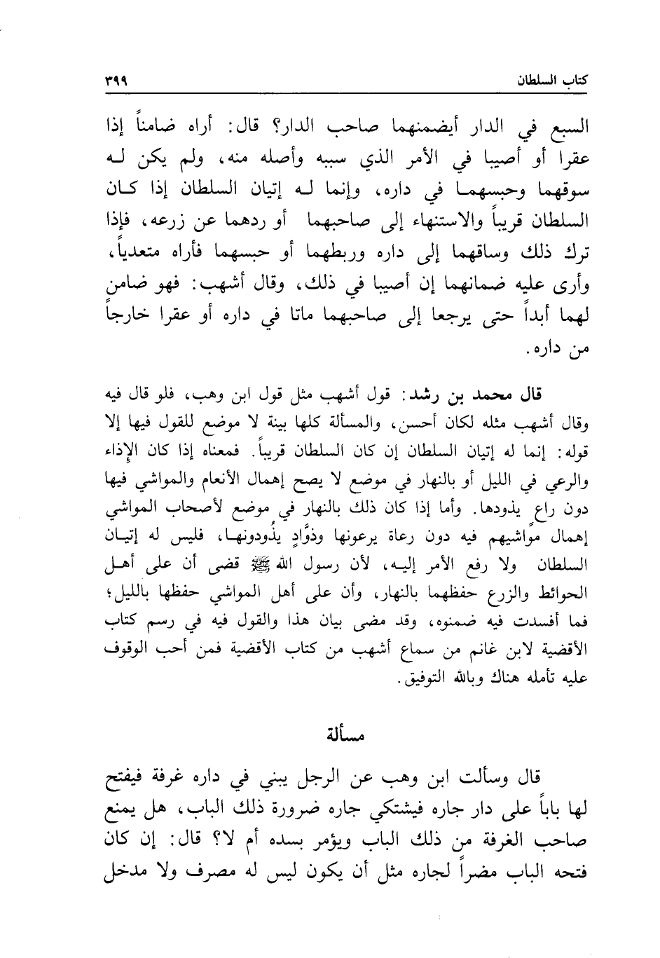 السبع في الدار أيضمنهما صاحب الدار؟ قال: أراه ضامنا إذا عقرا أو أصيبا في الأمر الذي سببه وأصله منه، ولم يكن له سوقهما وحبسهما في داره، وإنما له إتيان السلطان إذا كان السلطان قريبا والاستنهاء إلى صاحبهما أو ردهما عن زرعه، فإذا ترك ذلك وساقهما إلى داره وربطهما أو حبسهما فأراه متعديا، وأرى عليه ضمانهما إن أصيبا في ذلك، وقال أشهب: فهو ضامن لهما أبدا حتى يرجعا إلى صاحبهما ماتا في داره أو عقرا خارجا من داره.