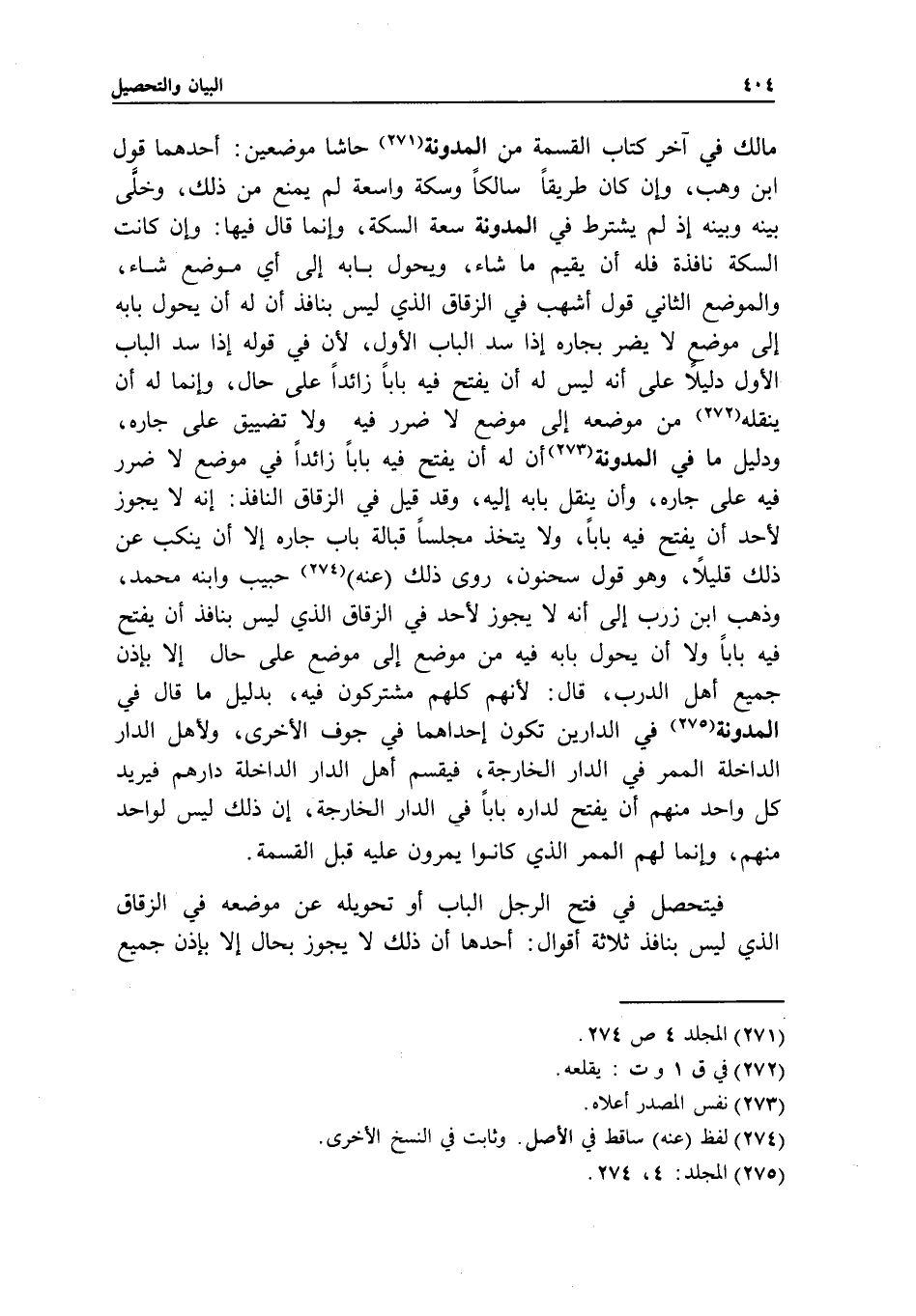 والموضع الثاني: قول أشهب في الزقاق الذي ليس بنافذ: إن له أن يحول بابه إلى موضع لا يضر بجاره إذا سد الباب الأول؛ لأن في قوله إذا سد الباب الأول دليلا على أنه ليس له أن يفتح فيه بابا زائدا على حال، وإنما له أن ينقله من موضعه إلى موضع لا ضرر فيه ولا تضييق على جاره. ودليل ما في المدونة: أن له أن يفتح فيه بابا زائدا في موضع لا ضرر فيه على جاره، وأن ينقل بابه إليه، وقد قيل في الزقاق النافذ: إنه لا يجوز لأحد أن يفتح فيه بابا، ولا يتخذ مجلسا قبالة باب جاره إلا أن ينكب عن ذلك قليلا، وهو قول سحنون، روى ذلك (عنه) حبيب وابنه محمد، وذهب ابن زرب إلى أنه لا يجوز لأحد في الزقاق الذي ليس بنافذ أن يفتح فيه بابا ولا أن يحول بابه فيه من موضع إلى موضع على حال إلا بإذن جميع أهل الدرب، قال: لأنهم كلهم مشتركون فيه، بدليل ما قال في المدونة في الدارين تكون إحداهما في جوف الأخرى، ولأهل الدار الداخلة الممر في الدار الخارجة، فيقسم أهل الدار الداخلة دارهم فيريد كل واحد منهم أن يفتح لداره بابا في الدار الخارجة: إن ذلك ليس لواحد منهم، وإنما لهم الممر الذي كانوا يمرون عليه قبل القسمة.
