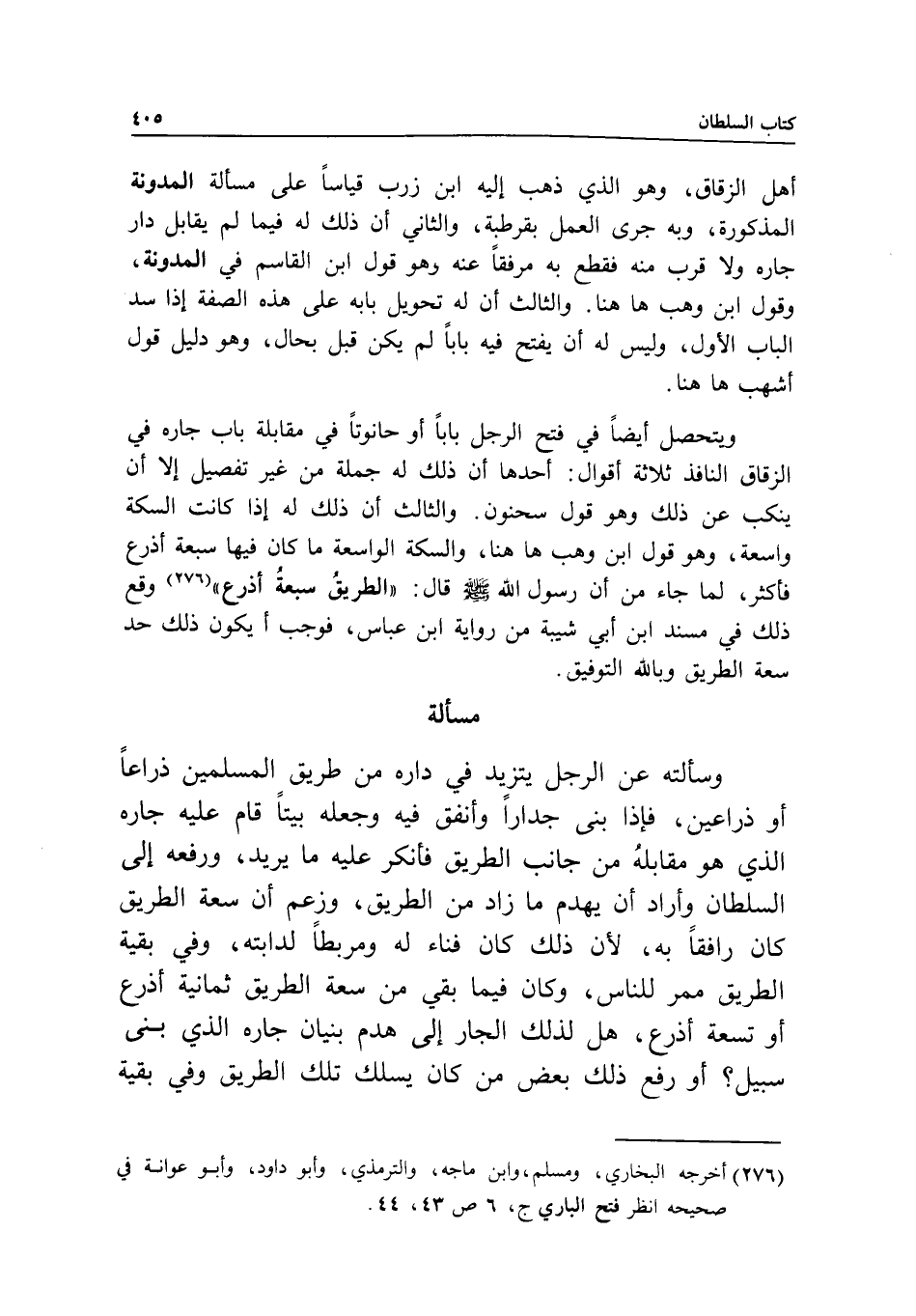 مسألة وسألته: عن الرجل يتزيد في داره من طريق المسلمين ذراعا أو ذراعين، فإذا بنى جدارا وأنفق فيه وجعله بيتا قام عليه جاره الذي هو مقابله من جانب الطريق فأنكر عليه ما يريد، ورفعه إلى السلطان وأراد أن يهدم ما زاد من الطريق، وزعم أن سعة الطريق كان رافقا به؛ لأن ذلك كان فناء له ومربطا لدابته، وفي بقية الطريق ممر للناس، وكان فيما بقي من سعة الطريق ثمانية أذرع أو تسعة أذرع، هل لذلك الجار إلى هدم بنيان جاره الذي بنى سبيل؟ أو رفع ذلك بعض من كان يسلك تلك الطريق وفي بقية