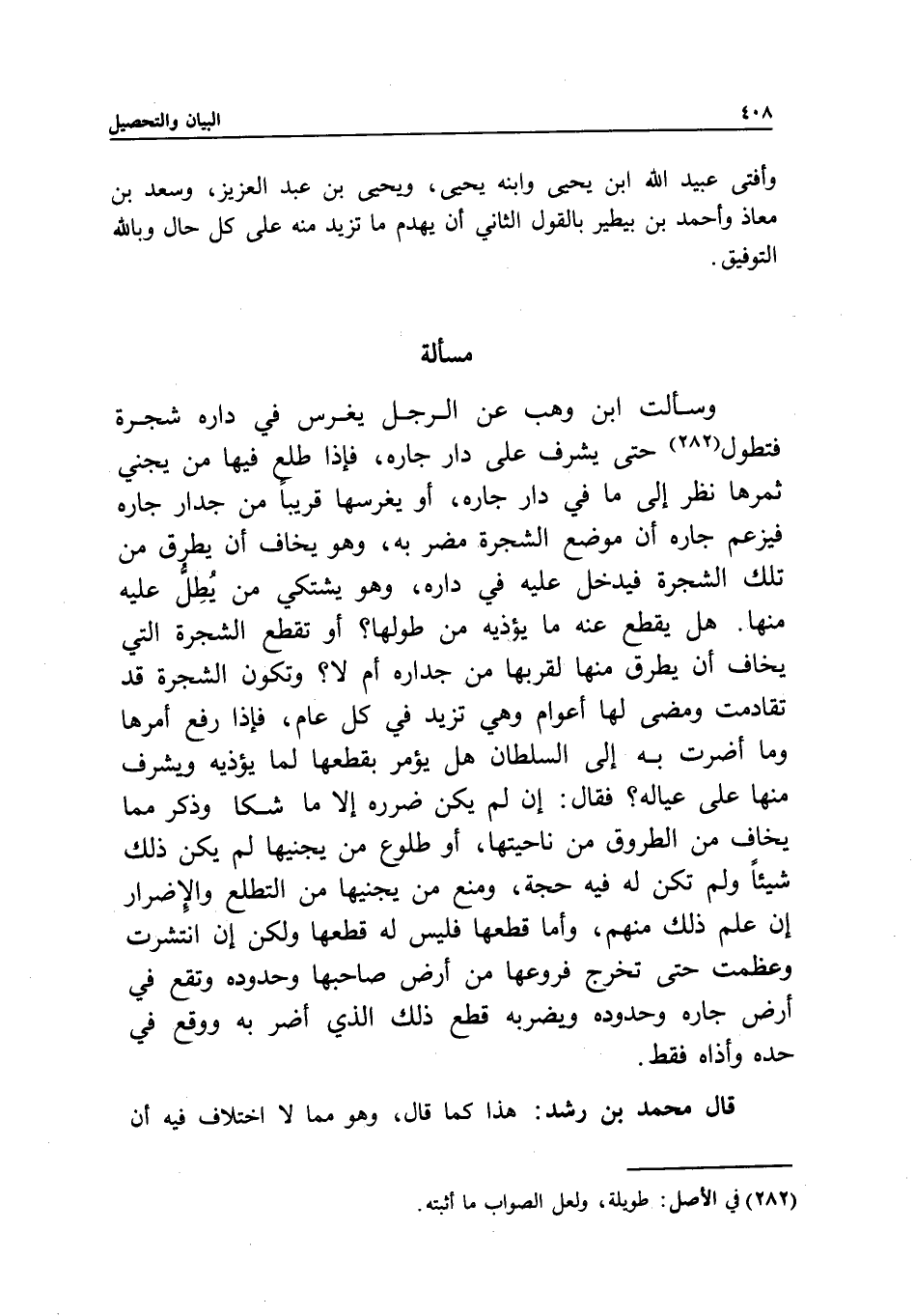 مسألة وسألت ابن وهب عن الرجل يغرس في داره شجرة فتطول حتى يشرف على دار جاره، فإذا طلع فيها من يجني ثمرها نظر إلى ما في دار جاره، أو يغرسها قريبا من جدار جاره فيزعم جاره أن موضع الشجرة مضر به، وهو يخاف أن يطرق من تلك الشجرة فيدخل عليه في داره، وهو يشتكي من يطل عليه منها، هل يقطع عنه ما يؤذيه من طولها؟ أو تقطع الشجرة التي يخاف أن يطرق منها لقربها من جداره أم لا؟ وتكون الشجرة قد تقادمت ومضى لها أعوام وهي تزيد في كل عام، فإذا رفع أمرها وما أضرت به إلى السلطان هل يؤمر بقطعها لما يؤذيه ويشرف منها على عياله؟