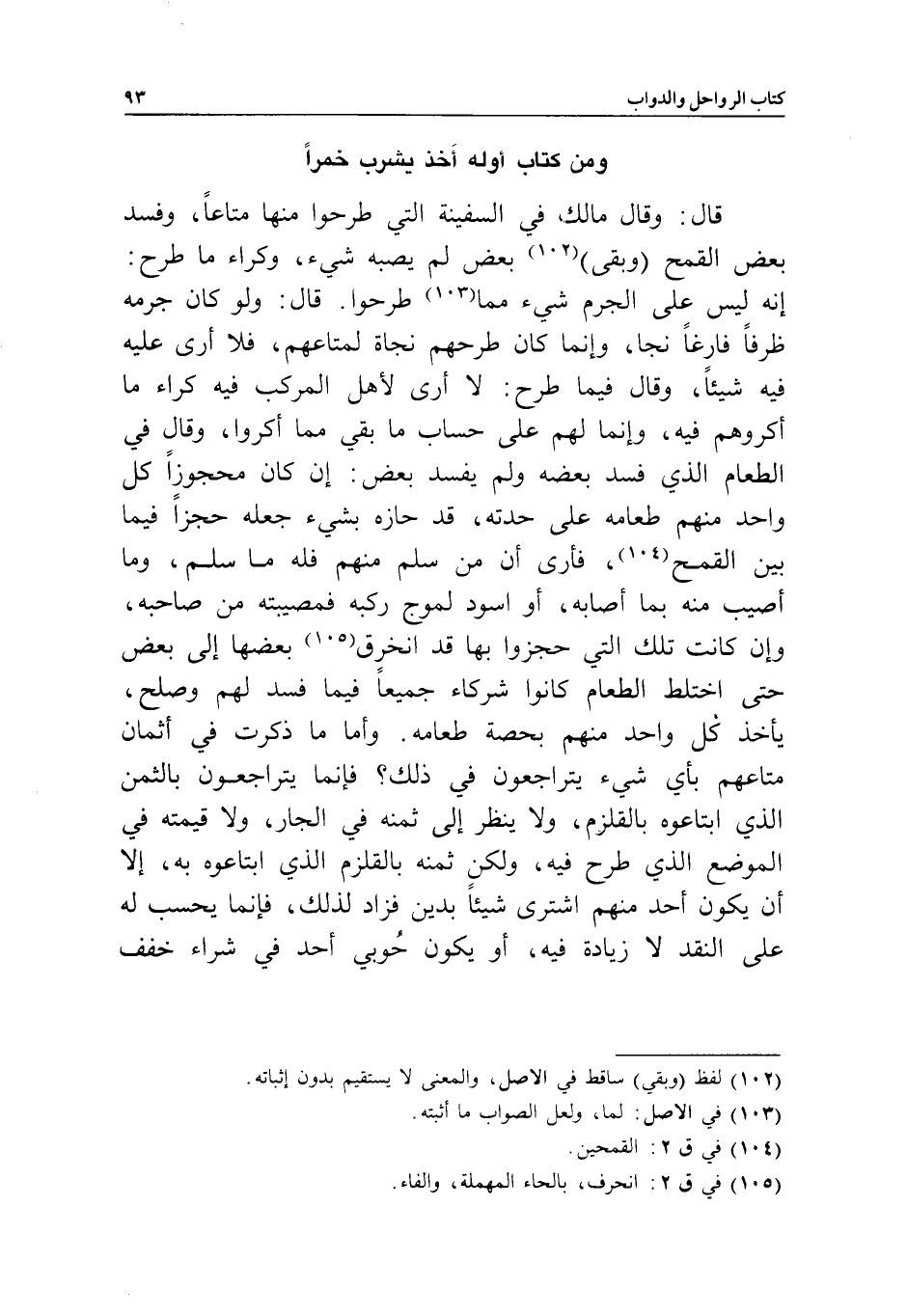 ومن كتاب أوله أخذ يشرب خمرا قال: وقال مالك، في السفينة التي طرحوا منها متاعا، وفسد بعض القمح وبقي بعض لم يصبه شيء، وكراء ما طرح: إنه ليس على الجرم شيء مما طرحوا.