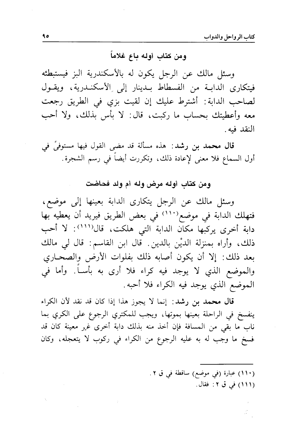 قال محمد بن رشد: إنما لا يجوز هذا إذا كان قد نقد؛ لأن الكراء ينفسخ في الراحلة بعينها بموتها، ويجب للمكتري الرجوع على الكري بما ناب ما بقي من المسافة فإن أخذ منه بذلك دابة أخرى غير معينة كان قد فسخ ما وجب له به عليه الرجوع من الكراء في ركوب لا يتعجله، وكان