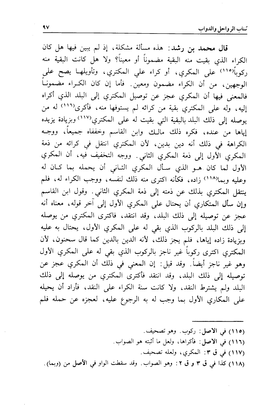 قال محمد بن رشد: هذه مسألة مشكلة، إذ لم يبين فيها هل كان الكراء الذي بقيت منه البقية مضمونا أو معينا؛ ولا هل كانت البقية منه ركوبا على المكري، أو كراء علي المكتري، وتأويلها يصح على الوجهين، من أن الكراء مضمون ومعين.