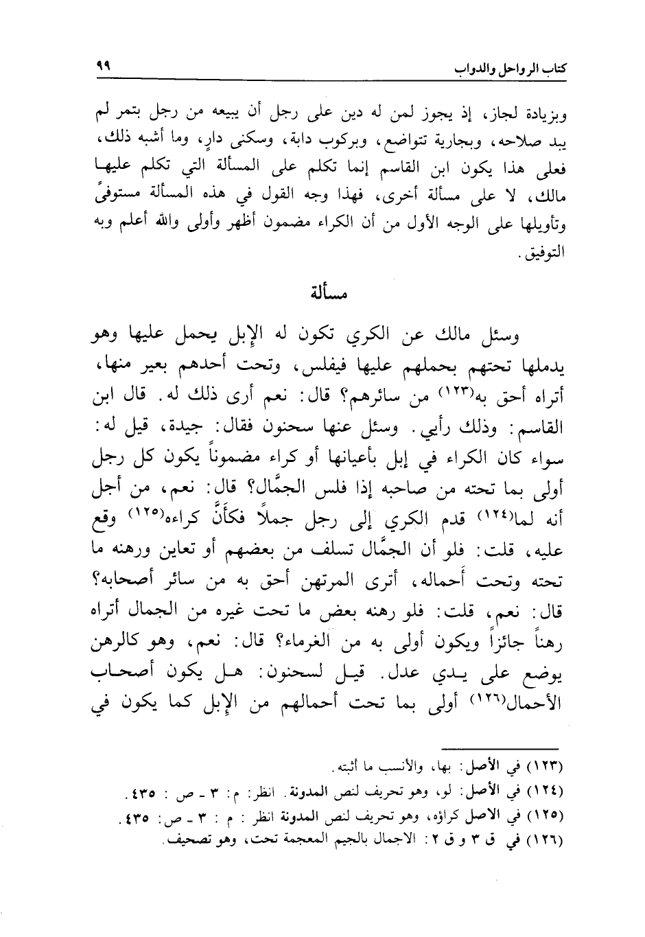 وسئل عنها سحنون، فقال: جيدة، قيل له: سواء كان الكراء في إبل بأعيانها أو كراء مضمونا يكون كل رجل أولى بما تحته من صاحبه إذا فلس الجمال؟ قال: نعم، من أجل أنه لما قدم الكري إلى رجل جملا فكأن كراءه وقع عليه، قلت: فلو أن الجمال تسلف من بعضهم أو تعاين ورهنه ما تحته وتحت أحماله، أترى المرتهن أحق به من سائر أصحابه؟ قال: نعم، قلت: فلو رهنه بعض ما تحت غيره من الجمال، أتراه رهنا جائزا، ويكون أولى به من الغرماء؟ قال: نعم، وهو كالرهن يوضع على يدي عدل.