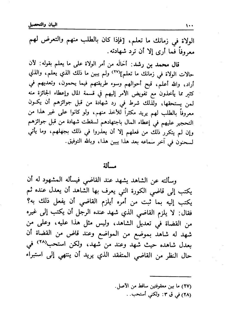 قال محمد بن رشد: أحاله من أمر الولاة على ما يعلم بقوله: لأن حالات الولاة في زمانك ما تعلم] ولم يبين ما ذلك الذي يعلم، والذي أراد، والله أعلم، قبح أحوالهم وسوء طريقتهم فيما يحمون، وتعديهم في كثير مما يأخذون مع تفويض الأمر إليهم في قسمة المال وإعطاء الجائزة منه لمن يستحقها، ولذلك شرط في رد شهادة من قبل جوائزهم أن يكون معروفا بالطلب لهم يريد مكثرا للأخذ منهم، ولو كانوا على غير هذا من التحجير عليهم في إعطاء المال باجتهادهم لسقطت شهادة من قبل جوائزهم وإن لم يتكرر ذلك من فعلهم إلا أن يعذروا في ذلك بجهلهم، وما يأتي لسحنون في آخر سماعه بعد هذا يبين هذا، وبالله التوفيق.