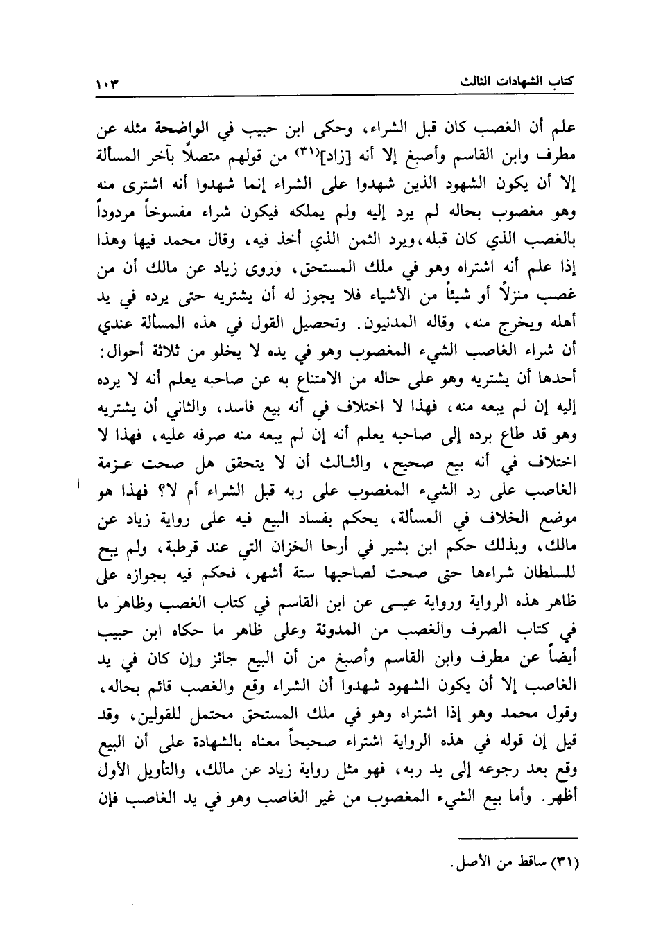 والثالث: أن لا يتحقق هل صحت عزمة الغاصب على رد الشيء المغصوب على ربه قبل الشراء أم لا؟ فهذا هو موضع الخلاف في المسألة، يحكم بفساد البيع فيه على رواية زياد عن مالك، وبذلك حكم ابن بشير في أرحا الخزان التي عند قرطبة، ولم يبح للسلطان شراءها حتى صحت لصاحبها ستة أشهر، فحكم فيه بجوازه على ظاهر هذه الرواية ورواية عيسى عن ابن القاسم في كتاب الغصب وظاهر ما في كتاب الصرف والغصب من المدونة وعلى ظاهر ما حكاه ابن حبيب أيضا عن مطرف وابن القاسم وأصبغ من أن البيع جائز وإن كان في يد الغاصب إلا أن يكون الشهود شهدوا أن الشراء وقع والغصب قائم بحاله، وقول محمد وهو إذا اشتراه وهو في ملك المستحق محتمل للقولين، وقد قيل: إن قوله في هذه الرواية اشتراء صحيحا معناه بالشهادة على أن البيع وقع بعد رجوعه إلى يد ربه، فهو مثل رواية زياد عن مالك، والتأويل الأول أظهر، وأما بيع الشيء المغصوب من غير الغاصب وهو في يد الغاصب فإن