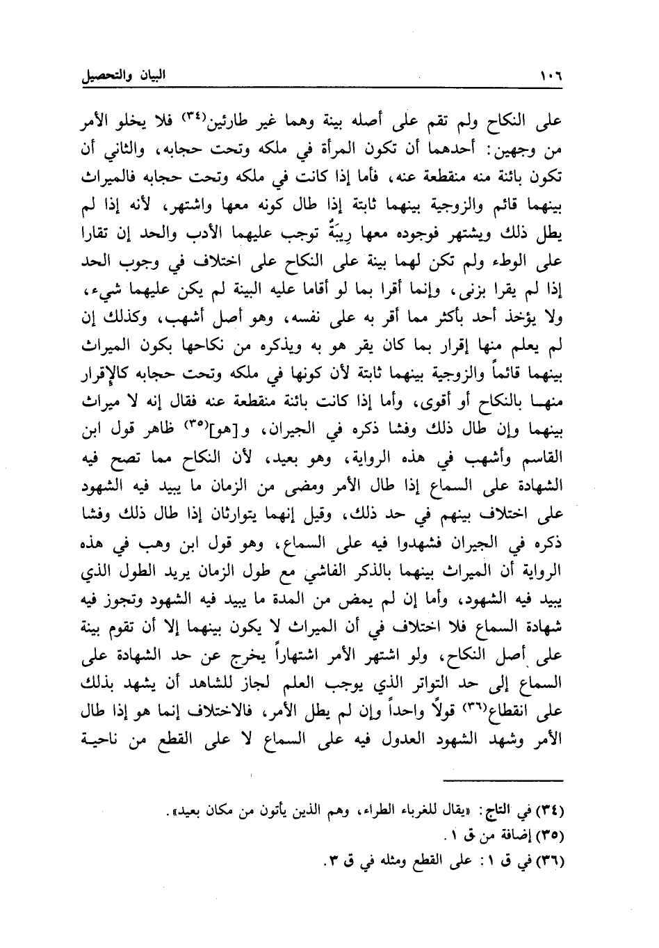 والثاني: أن تكون بائنة منه منقطعة عنه، فأما إذا كانت في ملكه وتحت حجابه فالميراث بينهما قائم والزوجية بينهما ثابتة إذا طال كونه معها واشتهر؛ لأنه إذا لم يطل ذلك ويشتهر فوجوده معها ريبة توجب عليهما الأدب والحد إن تقارا على الوطء ولم تكن لهما بينة على النكاح على اختلاف في وجوب الحد إذا لم يقرا بزنى، وإنما أقرا بما لو أقاما عليه البينة لم يكن عليهما شيء، ولا يؤخذ أحد بأكثر مما أقر به على نفسه، وهو أصل أشهب، وكذلك إن لم يعلم منها إقرار بما كان يقر هو به ويذكره من نكاحها بكون الميراث بينهما قائما والزوجية بينهما ثابتة؛ لأن كونها في ملكه وتحت حجابه كالإقرار منها بالنكاح أو أقوى، وأما إذا كانت بائنة منقطعة عنه فقال: إنه لا ميراث بينهما وإن طال ذلك وفشا ذكره في الجيران، و [هو] ظاهر قول ابن القاسم وأشهب في هذه الرواية، وهو بعيد؛ لأن النكاح مما تصح فيه الشهادة على السماع إذا طال الأمر ومضى من الزمان ما يبيد فيه الشهود على اختلاف بينهم في حد ذلك، وقيل: إنهما يتوارثان إذا طال ذلك وفشا ذكره في الجيران فشهدوا فيه على السماع، وهو قول ابن وهب في هذه الرواية أن الميراث بينهما بالذكر الفاشي مع طول الزمان يريد الطول الذي يبيد فيه الشهود، وأما إن لم يمض من المدة ما يبيد فيه الشهود وتجوز فيه شهادة السماع فلا اختلاف في أن الميراث لا يكون بينهما إلا أن تقوم بينة على أصل النكاح، ولو اشتهر الأمر اشتهارا يخرج عن حد الشهادة على السماع إلى حد التواتر الذي يوجب العلم لجاز للشاهد أن يشهد بذلك على انقطاع قولا واحدا، وإن لم يطل الأمر، فالاختلاف إنما هو إذا طال الأمر وشهد الشهود العدول فيه على السماع لا على القطع من ناحية