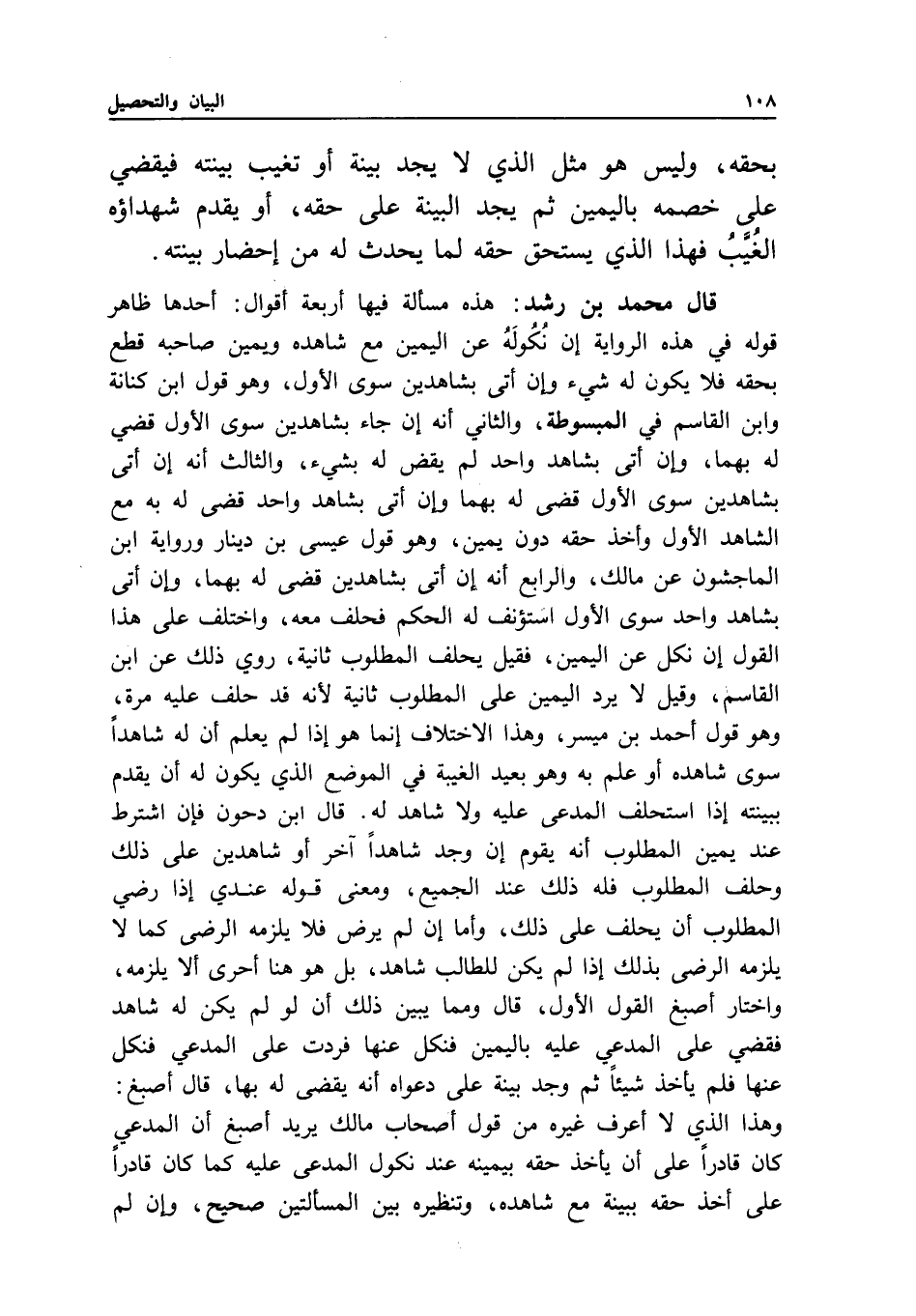 قال محمد بن رشد: هذه مسألة فيها أربعة أقوال؛ أحدها: ظاهر قوله في هذه الرواية إن نكوله عن اليمين مع شاهده ويمين صاحبه قطع بحقه فلا يكون له شيء، وإن أتى بشاهدين سوى الأول، وهو قول ابن كنانة وابن القاسم في المبسوطة.
