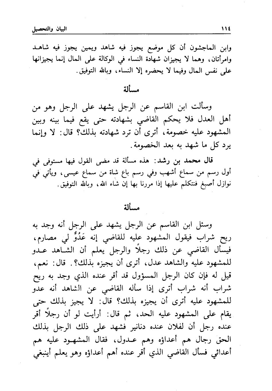 مسألة وسألت ابن القاسم: عن الرجل يشهد على الرجل وهو من أهل العدل فلا يحكم القاضي بشهادته حتى يقع فيما بينه وبين المشهود عليه خصومة، أترى أن ترد شهادته بذلك؟ قال: لا وإنما يرد كل ما شهد به بعد الخصومة.