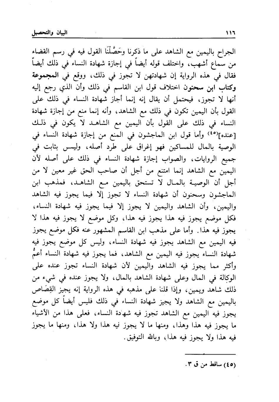 الجراح باليمين مع الشاهد على ما ذكرنا وحصلنا القول فيه في رسم القضاء من سماع أشهب، واختلف قوله أيضا في إجازة شهادة النساء في ذلك أيضا فقال في هذه الرواية: إن شهادتهن لا تجوز في ذلك، ووقع في المجموعة وكتاب ابن سحنون اختلاف قول ابن القاسم في ذلك، وأن الذي رجع إليه أنها لا تجوز، فيحتمل أن يقال: إنه إنما أجاز شهادة النساء في ذلك على القول بأن اليمين تكون في ذلك مع الشاهد، وأنه إنما منع من إجازة شهادة النساء في ذلك على القول بأن اليمين مع الشاهد لا يكون في ذلك [عنده] وأما قول ابن الماجشون في المنع من إجازة شهادة النساء في الوصية بالمال للمساكين فهو إغراق على طرد أصله، وليس بثابت في جميع الروايات، والصواب إجازة شهادة النساء في ذلك على أصله؛ لأن اليمين مع الشاهد إنما امتنع من أجل أن صاحب الحق غير معين لا من أجل أن الوصية بالمال لا تستحق باليمين مع الشاهد، فمذهب ابن الماجشون وسحنون أن شهادة النساء لا تجوز إلا فيما يجوز فيه الشاهد واليمين، وأن الشاهد واليمين لا يجوز إلا فيما يجوز فيه شهادة النساء، فكل موضع يجوز فيه هذا يجوز فيه هذا، وكل موضع لا يجوز فيه هذا لا يجوز فيه هذا.