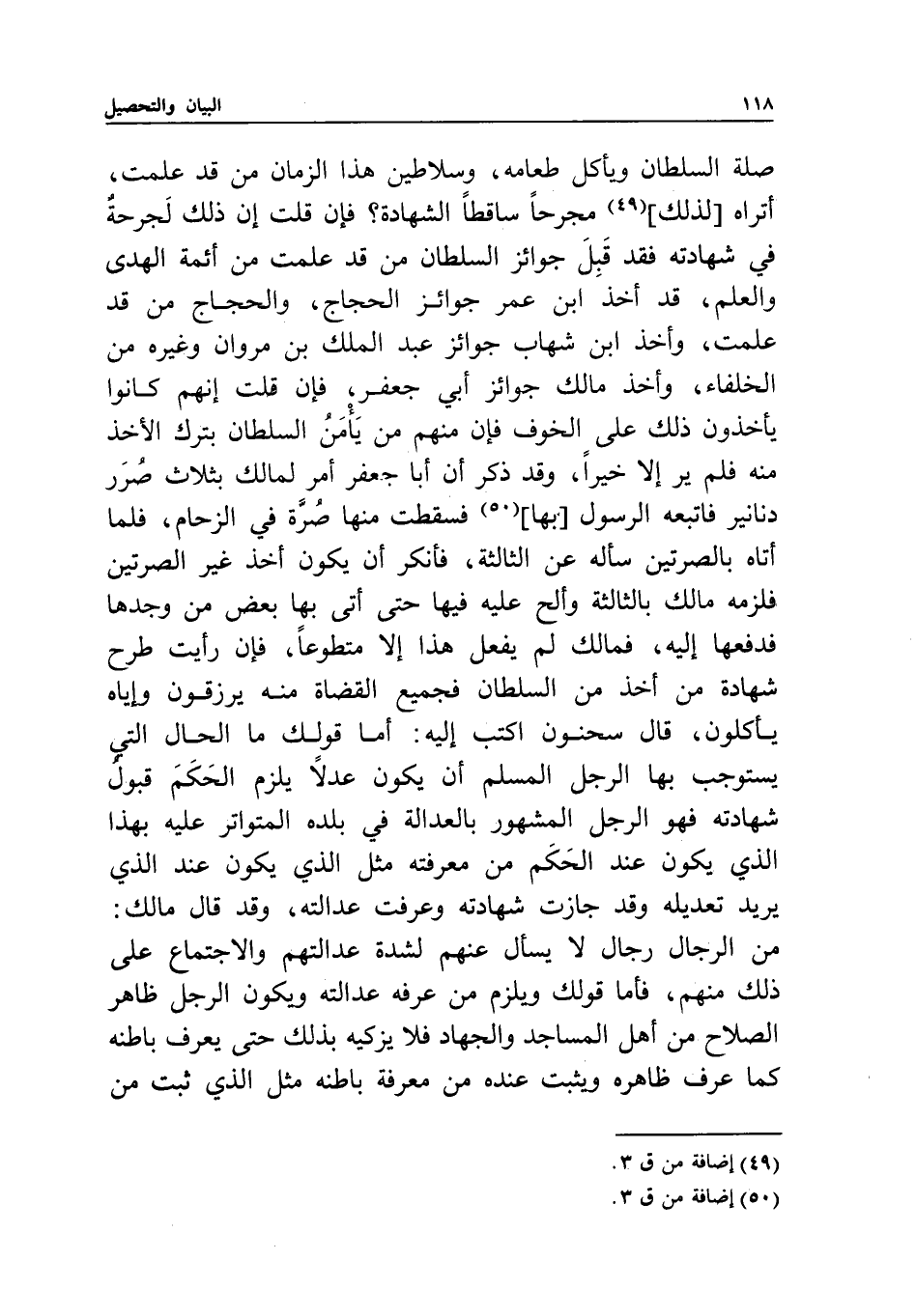 صلة السلطان ويأكل طعامه، وسلاطين هذا الزمان من قد علمت، أتراه [لذلك] مجرحا ساقطا الشهادة؟ فإن قلت: إن ذلك لجرحة في شهادته فقد قبل جوائز السلطان من قد علمت من أئمة الهدى والعلم، قد أخذ ابن عمر جوائز الحجاج، والحجاج من قد علمت، وأخذ ابن شهاب جوائز عبد الملك بن مروان وغيره من الخلفاء، وأخذ مالك جوائز أبي جعفر، فإن قلت: إنهم كانوا يأخذون ذلك على الخوف فإن منهم من يأمن السلطان بترك الأخذ منه فلم ير إلا خيرا، وقد ذكر أن أبا جعفر أمر لمالك بثلاث صرر دنانير فاتبعه الرسول [بها] . فسقطت منها صرة في الزحام، فلما أتاه بالصرتين سأله عن الثالثة، فأنكر أن يكون أخذ غير الصرتين فلزمه مالك بالثالثة وألح عليه فيها حتى أتى بها بعض من وجدها فدفعها إليه، فمالك لم يفعل هذا إلا متطوعا، فإن رأيت طرح شهادة من أخذ من السلطان فجميع القضاة منه يرزقون وإياه يأكلون، قال سحنون: اكتب إليه: أما قولك: ما الحال التي يستوجب بها الرجل المسلم أن يكون عدلا يلزم الحكم قبول شهادته فهو الرجل المشهور بالعدالة في بلده المتواتر عليه بهذا الذي يكون عند الحكم من معرفته مثل الذي يكون عند الذي يريد تعديله وقد جازت شهادته وعرفت عدالته، وقد قال مالك: من الرجال رجال لا يسأل عنهم لشدة عدالتهم والاجتماع على ذلك منهم، فأما قولك ويلزم من عرفه عدالته ويكون الرجل ظاهر الصلاح من أهل المساجد والجهاد فلا يزكيه بذلك حتى يعرف باطنه كما عرف ظاهره ويثبت عنده من معرفة باطنه مثل الذي ثبت من