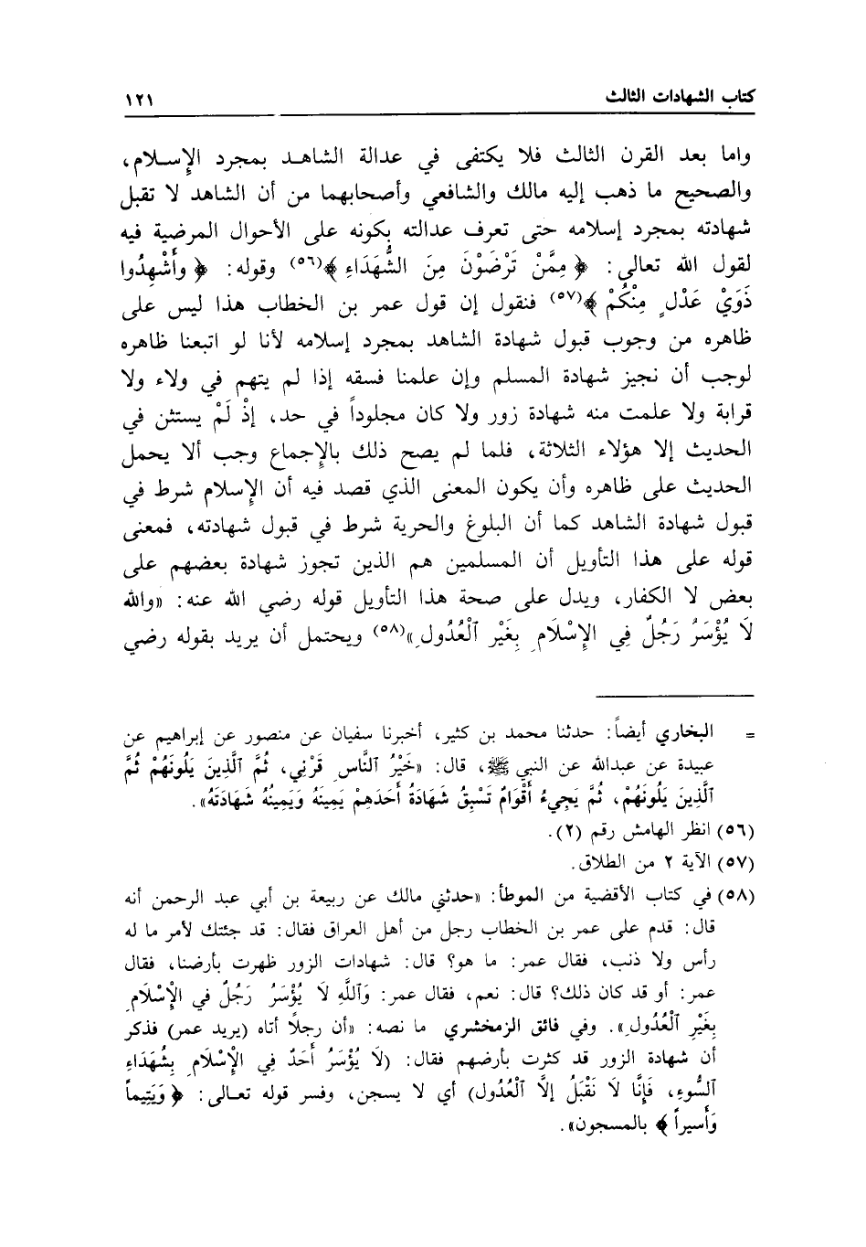 وأما بعد القرن الثالث، فلا يكتفي في عدالة الشاهد بمجرد الإسلام، والصحيح ما ذهب إليه مالك والشافعي وأصحابهما من أن الشاهد لا تقبل شهادته بمجرد إسلامه حتى تعرف عدالته بكونه على الأحوال المرضية فيه لقول الله تعالى: {مِمَّنْ تَرْضَوْنَ مِنَ الشُّهَدَاءِ} [البقرة: 282] وقوله: {وَأَشْهِدُوا ذَوَيْ عَدْلٍ مِنْكُمْ} [الطلاق: 2] فنقول: إن قول عمر بن الخطاب هذا ليس على ظاهره من وجوب قبول شهادة الشاهد بمجرد إسلامه؛ لأنا لو اتبعنا ظاهره لوجب أن نجيز شهادة المسلم وإن علمنا فسقه إذا لم يتهم في ولاء، ولا قرابة ولا علمت منه شهادة زور ولا كان مجلودا في حد، إذ لم يستثن في الحديث إلا هؤلاء الثلاثة، فلما لم يصح ذلك بالإجماع وجب ألا يحمل الحديث على ظاهره، وأن يكون المعنى الذي قصد فيه أن الإسلام شرط في قبول شهادة الشاهد كما أن البلوغ والحرية شرط في قبول شهادته، فمعنى قوله على هذا التأويل أن المسلمين هم الذين تجوز شهادة بعضهم على بعض لا الكفار، ويدل على صحة هذا التأويل قوله - رَضِيَ اللَّهُ عَنْهُ -: "والله لا يؤسر رجل في الإسلام بغير العدول " ويحتمل أن يريد بقوله رضي