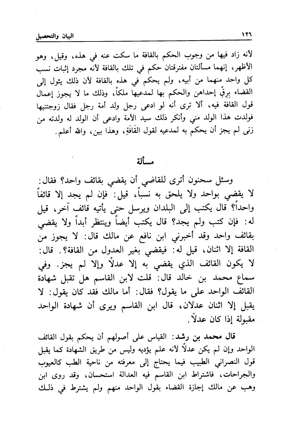 مسألة وسئل سحنون: أترى للقاضي أن يقضي بقائف واحد؟ فقال: لا يقضي بواحد ولا يلحق به نسبا، قيل: فإن لم يجد إلا قائفا واحدا؟ قال: يكتب إلى البلدان ويرسل حتى يأتيه قائف آخر، قيل له: فإن كتب ولم يجد؟ قال: يكتب أيضا وينتظر أبدا ولا يقضي بقائف واحد وقد أخبرني ابن نافع عن مالك قال: لا يجوز من القافة إلا اثنان، قيل له: فيقضي بغير العدول من القافة؟ قال: لا يكون القائف الذي يقضي به إلا عدلا وإلا لم يجز، وفي سماع محمد بن خالد قال: قلت لابن القاسم: هل تقبل شهادة القائف الواحد على ما يقول؟ فقال: أما مالك فقد كان يقول: لا يقبل إلا اثنان عدلان، قال ابن القاسم: ويرى أن شهادة الواحد مقبولة إذا كان عدلا.