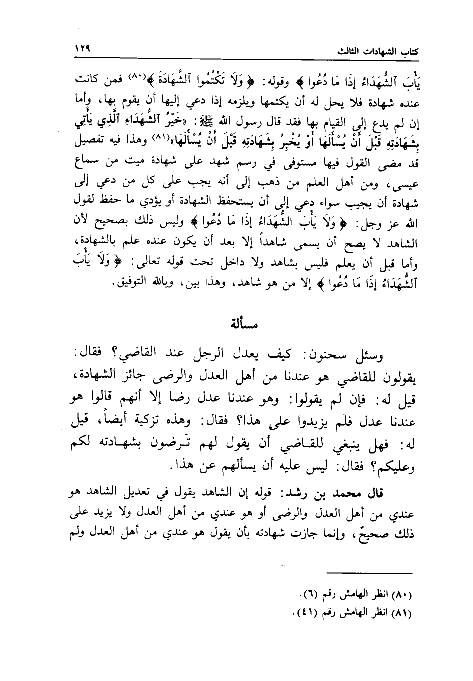 {وَلا يَأْبَ الشُّهَدَاءُ إِذَا مَا دُعُوا} [البقرة: 282] وقوله: {وَلا تَكْتُمُوا الشَّهَادَةَ} [البقرة: 283] فمن كانت عنده شهادة فلا يحل له أن يكتمها ويلزمه إذا دعي إليها أن يقوم بها، وأما إن لم يدع إلى القيام بها فقد قال رسول الله - صَلَّى اللَّهُ عَلَيْهِ وَسَلَّمَ -: «خير الشهداء الذي يأتي بشهادته قبل أن يسألها أو يخبر بشهادته قبل أن يسألها» وهذا فيه تفصيل قد مضى القول فيها مستوفى في رسم شهد على شهادة ميت من سماع عيسى، ومن أهل العلم من ذهب إلى أنه يجب على كل من دعي إلى شهادة أن يجيب سواء دعي إلى أن يستحفظ الشهادة أو يؤدي ما حفظ لقول الله عز وجل: {وَلا يَأْبَ الشُّهَدَاءُ إِذَا مَا دُعُوا} [البقرة: 282] وليس ذلك بصحيح؛ لأن الشاهد لا يصح أن يسمى شاهدا إلا بعد أن يكون عنده علم بالشهادة، وأما قبل أن يعلم فليس بشاهد ولا داخل تحت قَوْله تَعَالَى: {وَلا يَأْبَ الشُّهَدَاءُ إِذَا مَا دُعُوا} [البقرة: 282] إلا من هو شاهد، وهذا بين، وبالله التوفيق.