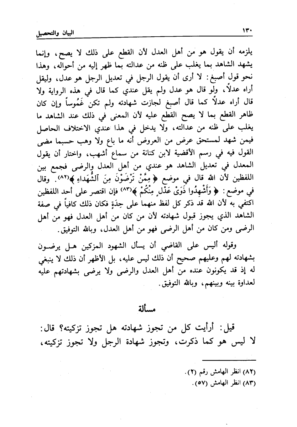 مسألة قيل: أرأيت كل من تجوز شهادته هل تجوز تزكيته؟ قال: لا ليس هو كما ذكرت، وتجوز شهادة الرجل ولا تجوز تزكيته،