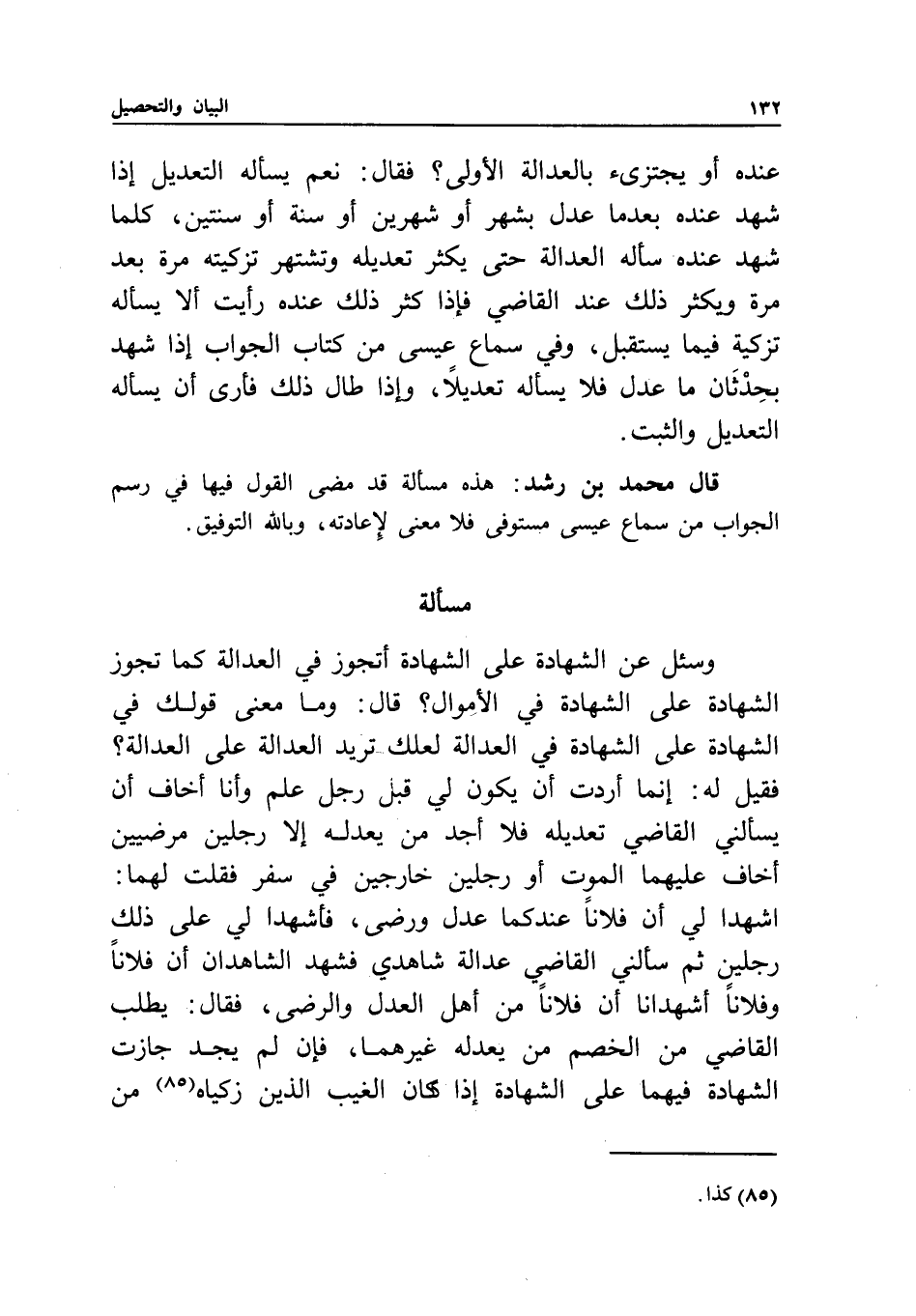 عنده أو يجتزئ بالعدالة الأولى؟ فقال: نعم يسأله التعديل إذا شهد عنده بعدما عدل بشهر أو شهرين أو سنة أو سنتين، كلما شهد عنده سأله العدالة حتى يكثر تعديله وتشتهر تزكيته مرة بعد مرة ويكثر ذلك عند القاضي فإذا كثر ذلك عنده رأيت ألا يسأله تزكية فيما يستقبل، وفي سماع عيسى من كتاب الجواب إذا شهد بحدثان ما عدل فلا يسأله تعديلا، وإذا طال ذلك فأرى أن يسأله التعديل والثبت.