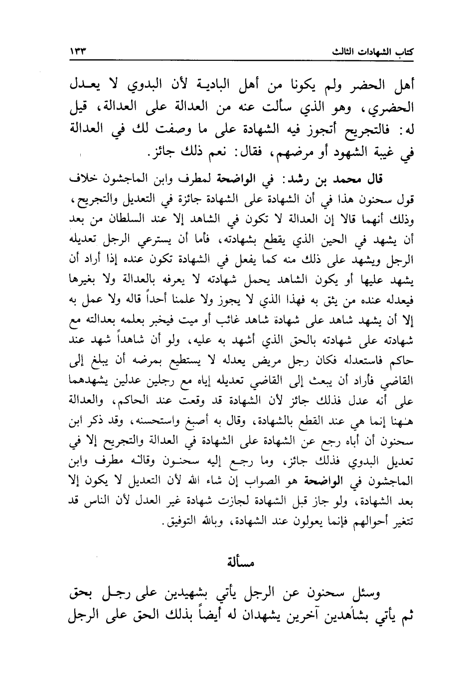 أهل الحضر ولم يكونا من أهل البادية؛ لأن البدوي لا يعدل الحضري، وهو الذي سألت عنه من العدالة على العدالة، قيل له: فالتجريح أتجوز فيه الشهادة على ما وصفت لك في العدالة في غيبة الشهود أو مرضهم، فقال: نعم ذلك جائز.
