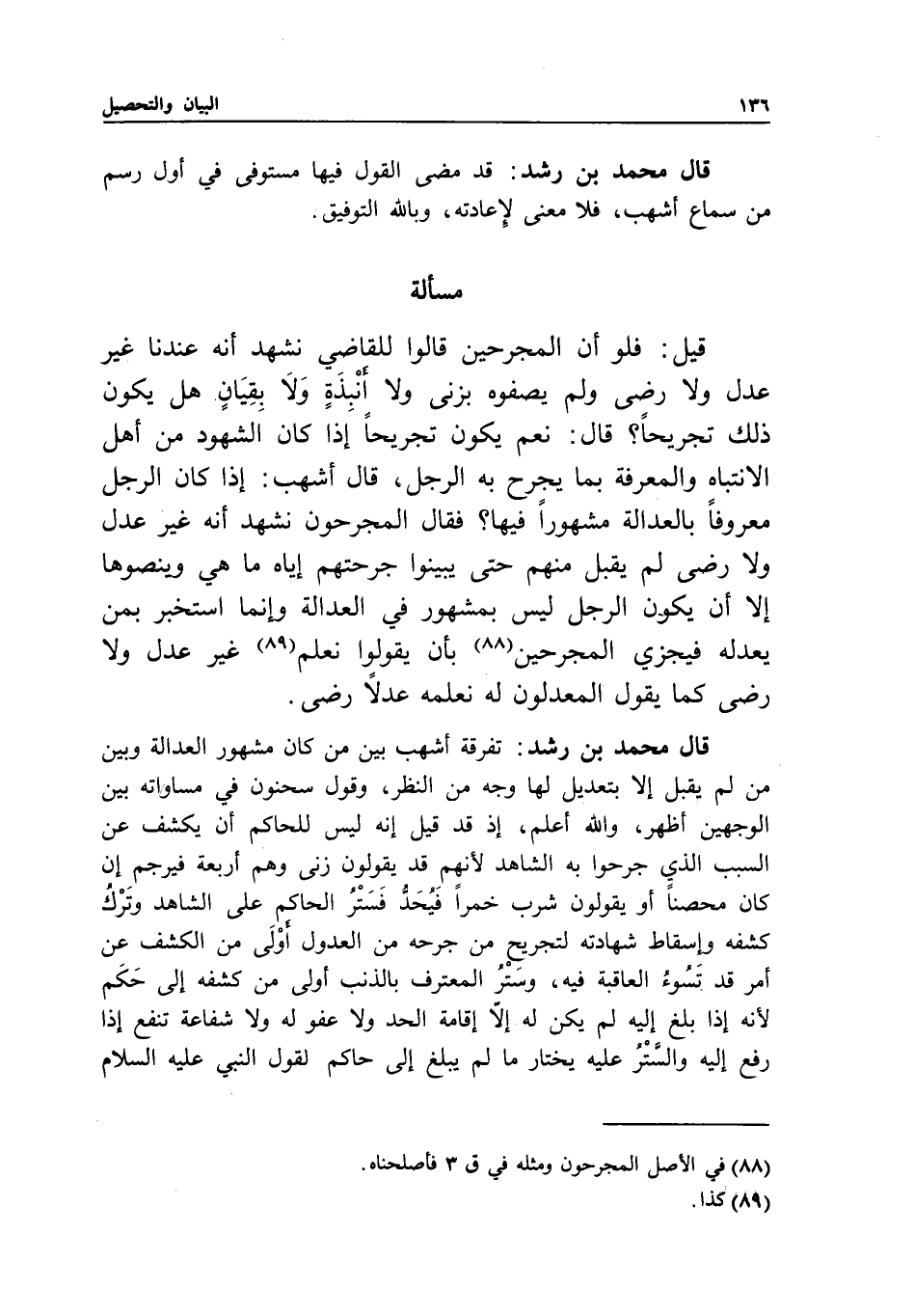 قال محمد بن رشد: تفرقة أشهب بين من كان مشهور العدالة وبين من لم يقبل إلا بتعديل لها وجه من النظر، وقول سحنون في مساواته بين الوجهين أظهر، والله أعلم؛ إذ قد قيل: إنه ليس للحاكم أن يكشف عن السبب الذي جرحوا به الشاهد؛ لأنهم قد يقولون: زنى وهم أربعة فيرجم إن كان محصنا أو يقولون: شرب خمرا فيحد فستر الحاكم على الشاهد وترك كشفه وإسقاط شهادته لتجريح من جرحه من العدول أولى من الكشف عن أمر قد تسوء العاقبة فيه، وستر المعترف بالذنب أولى من كشفه إلى حكم؛ لأنه إذا بلغ إليه لم يكن له إلا إقامة الحد ولا عفو له ولا شفاعة تنفع إذا رفع إليه والستر عليه يختار ما لم يبلغ إلى حاكم لقول النبي - عَلَيْهِ السَّلَامُ -