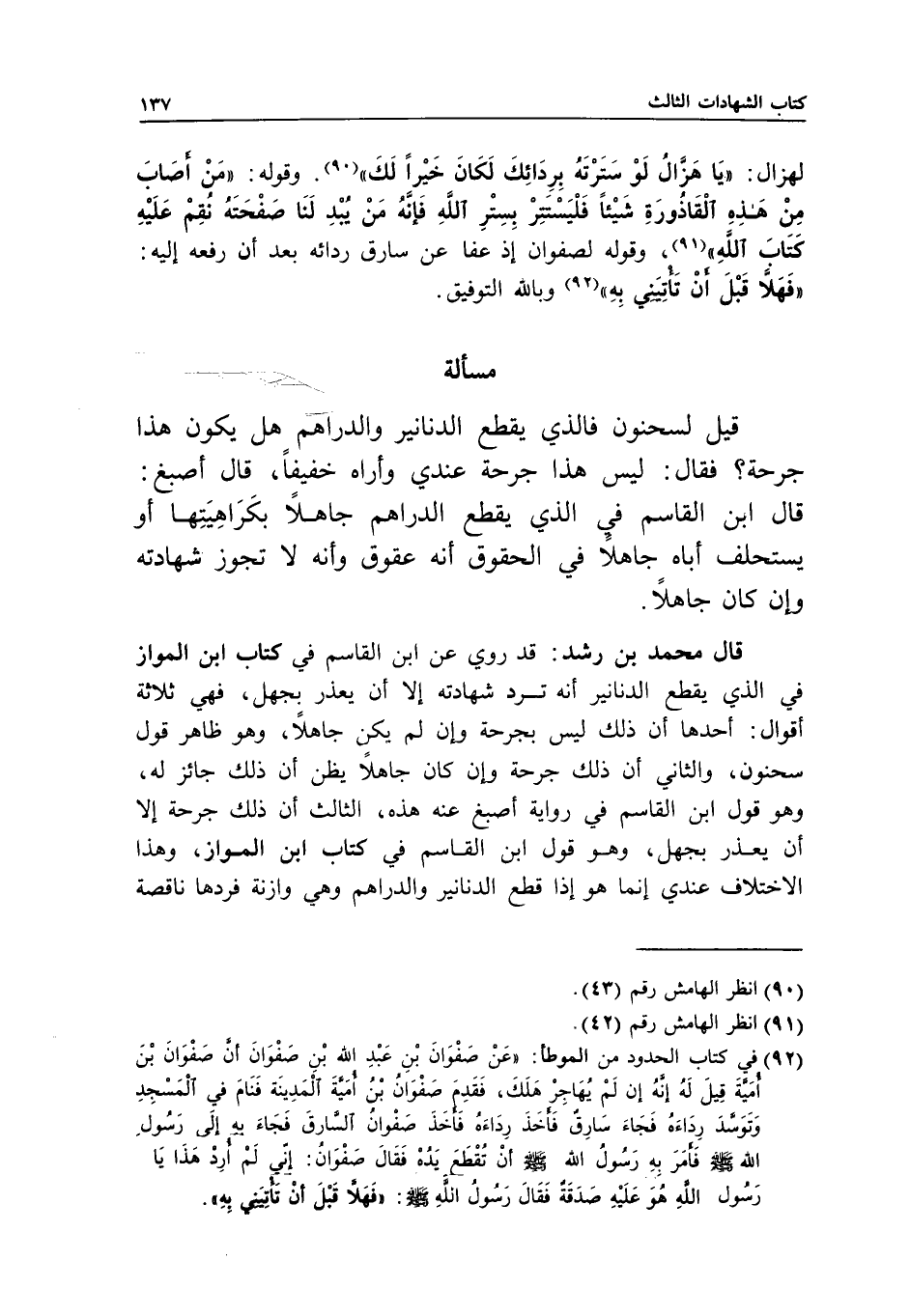 لهزال: «يا هزال، لو سترته بردائك؛ لكان خيرا لك» . وقوله: «من أصاب من هذه القاذورات شيئا، فليستتر بستر الله؛ فإنه من يبد لنا صفحته نقم عليه كتاب الله» ، وقوله لصفوان إذ عفا عن سارق ردائه بعد أن رفعه إليه: «فهلا قبل أن تأتيني به» وبالله التوفيق.