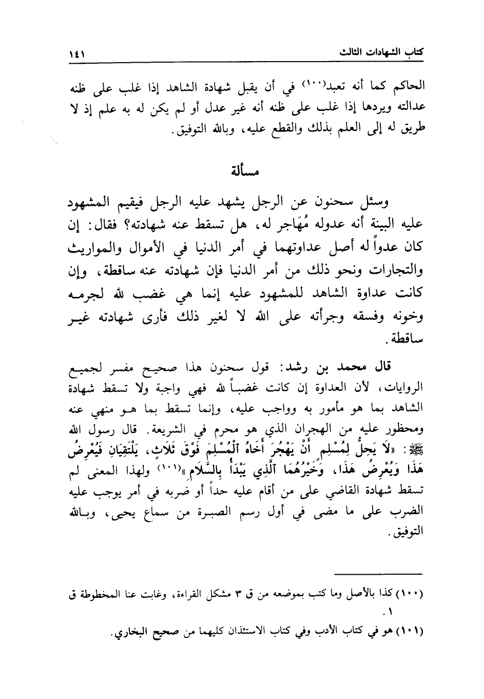 مسألة وسئل سحنون عن الرجل يشهد عليه الرجل، فيقيم المشهود عليه البينة أنه عدو له مُهَاجِر له، هل تسقط عنه شهادته؟ فقال: إن كان عدوا له أصل عداوتهما في أمر الدنيا في الأموال والمواريث والتجارات، ونحو ذلك من أمر الدنيا، فإن شهادته عنه ساقطة، وإن كانت عداوة الشاهد للمشهود عليه إنما هي غضب لله لجرمه وخونه وفسقه، وجرأته على الله، لا لغير ذلك، فأرى شهادته غير ساقطة.