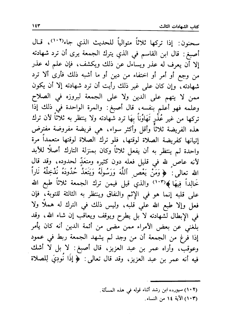 سحنون: إذا تركها ثلاثا متواليا؛ للحديث الذي جاء، قال أصبغ: قال ابن القاسم في الذي يترك الجمعة، يرى أن ترد شهادته، إلا أن يعرف له عذر، ويساءل عن ذلك ويكشف، فإن علم له عذر من وجع أو أمر أو اختفاء من دين، أو ما أشبه ذلك؛ فأرى ألا ترد شهادته، وإن كان على غير ذلك رأيت أن ترد شهادته إلا أن يكون ممن لا يتهم على الدين ولا على الجمعة لبروزه في الصلاح وعلمه، فهو أعلم بنفسه، قال أصبغ: والمرة الواحدة في ذلك إذا تركها من غير عذر تهاونا بها ترد شهادته، ولا ينتظر به ثلاثا؛ لأن ترك هذه الفريضة ثلاثا وأقل وأكثر سواء، هي فريضة مفروضة مفترض إتيانها كفريضة الصلاة لوقتها، فلو ترك الصلاة لوقتها متعمدا مرة واحدة لم ينتظر به أن يفعل ثلاثا، وكان بمنزلة التارك أصلا للأبد؛ لأنه عاص لله في قليل فعله دون كثيره، ومتعد لحدوده، وقد قال الله تعالى: {وَمَنْ يَعْصِ اللَّهَ وَرَسُولَهُ وَيَتَعَدَّ حُدُودَهُ يُدْخِلْهُ نَارًا خَالِدًا فِيهَا} [النساء: 14] .