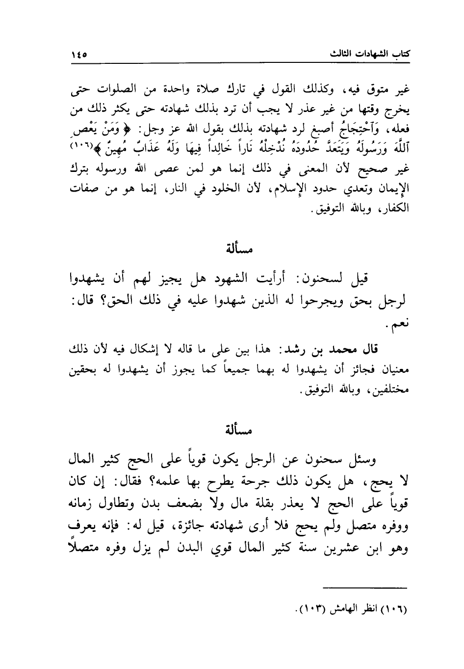 مسألة وسئل سحنون عن الرجل يكون قويا على الحج كثير المال لا يحج، هل يكون ذلك جرحة يطرح بها علمه؟ فقال: إن كان قويا على الحج لا يعذر بقلة مال، ولا بضعف بدن، وتطاول زمانه، ووفره متصل، ولم يحج، فلا أرى شهادته جائزة، قيل له: فإنه يعرف، وهو ابن عشرين سنة كثير المال، قوي البدن، لم يزل وفره متصلا