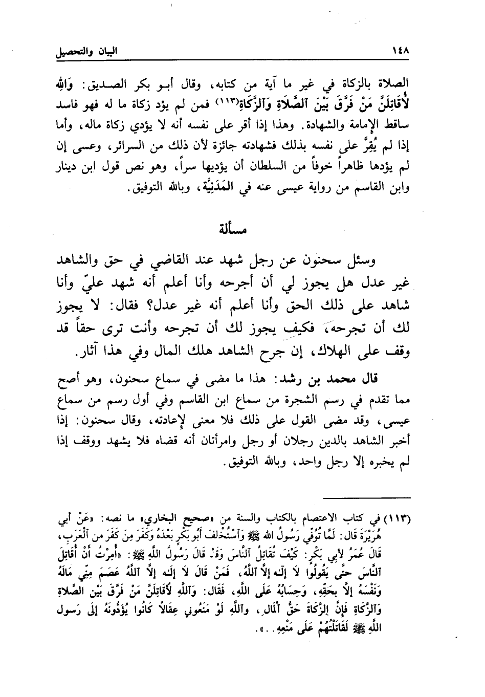 مسألة وسئل سحنون عن رجل شهد عند القاضي في حق، والشاهد غير عدل، هل يجوز لي أن أجرحه وأنا أعلم أنه شهد علي، وأنا شاهد على ذلك الحق، وأنا أعلم أنه غير عدل؟ فقال: لا يجوز لك أن تجرحه، فكيف يجوز لك أن تجرحه، وأنت ترى حقا قد وقف على الهلاك، إن جرح الشاهد هلك المال، وفي هذا آثار.