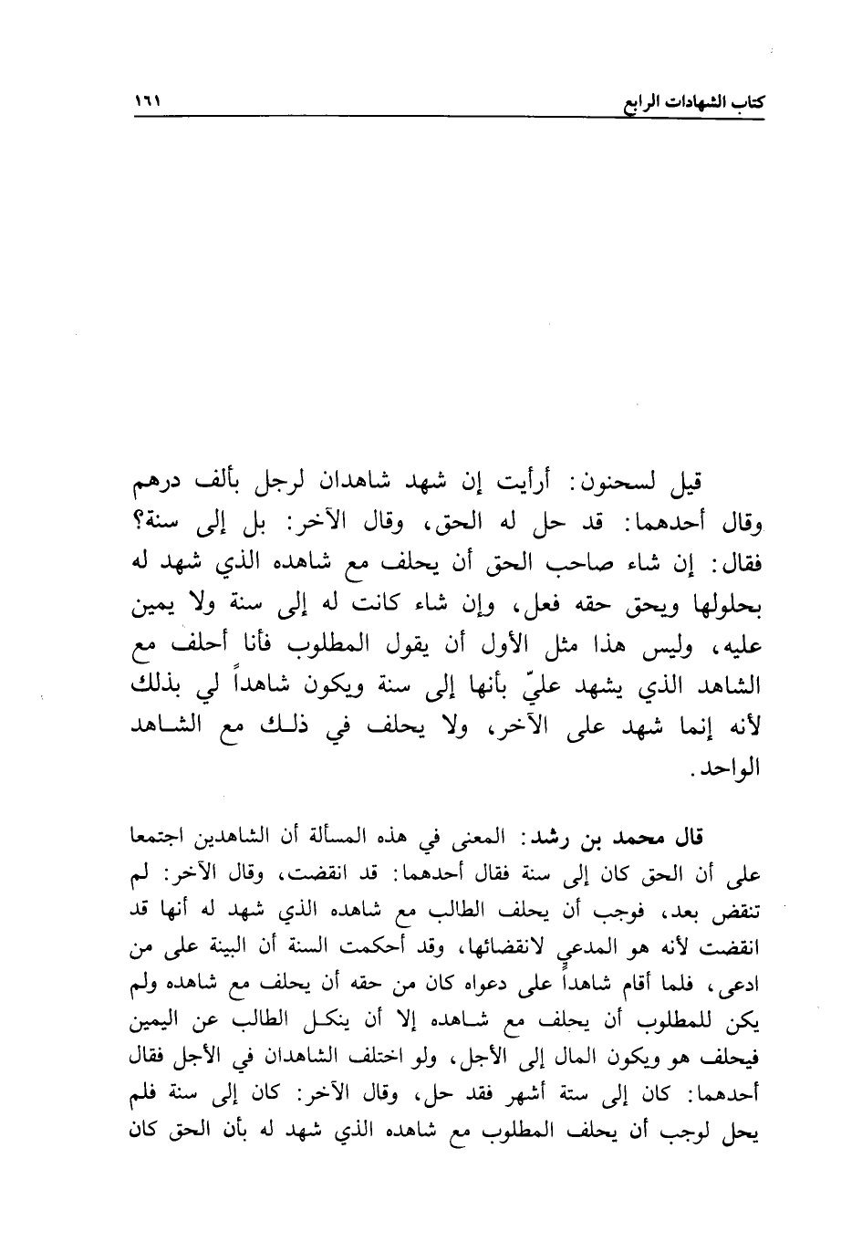 قيل لسحنون: أرأيت إن شهد شاهدان لرجل بألف درهم، وقال أحدهما: قد حل له الحق، وقال الآخر: بل إلى سنة؟ فقال: إن شاء صاحب الحق أن يحلف مع شاهده الذي شهد له بحلولها، ويحق حقه فعل، وإن شاء كانت له إلى سنة، ولا يمين عليه، وليس هذا مثل الأول أن يقول المطلوب، فأنا أحلف مع الشاهد الذي يشهد علي بأنها إلى سنة، ويكون شاهدا لي بذلك؛ لأنه إنما شهد على الآخر، ولا يحلف في ذلك مع الشاهد الواحد.