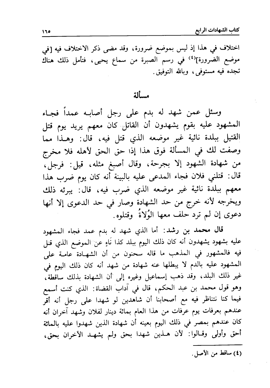قال محمد بن رشد: أما الذي شهد له بدم عمد، فجاء المشهود عليه بشهود يشهدون أنه كان ذلك اليوم ببلد كذا ناء عن الموضع الذي قتل فيه، فالمشهور في المذهب ما قاله سحنون من أن الشهادة عامة على المشهود عليه بالدم لا يبطلها عنه شهادة من شهد أنه كان ذلك اليوم في غير ذلك البلد، وقد ذهب إسماعيل وغيره إلى أن الشهادة بذلك ساقطة، وهو قول محمد بن عبد الحكم، قال في آداب القضاة: الذي كنت أسمع فيما كنا نتناظر فيه مع أصحابنا أن شاهدين لو شهدا على رجل أنه أقر عندهم بعرفات يوم عرفات من هذا العام بمائة دينار لفلان، وشهد آخران أنه كان عندهم بمصر في ذلك اليوم بعينه، أن شهادة الذين شهدوا عليه بالمائة أحق وأولى، وقالوا: لأن هذين شهدا بحق، ولم يشهد الآخران بحق،