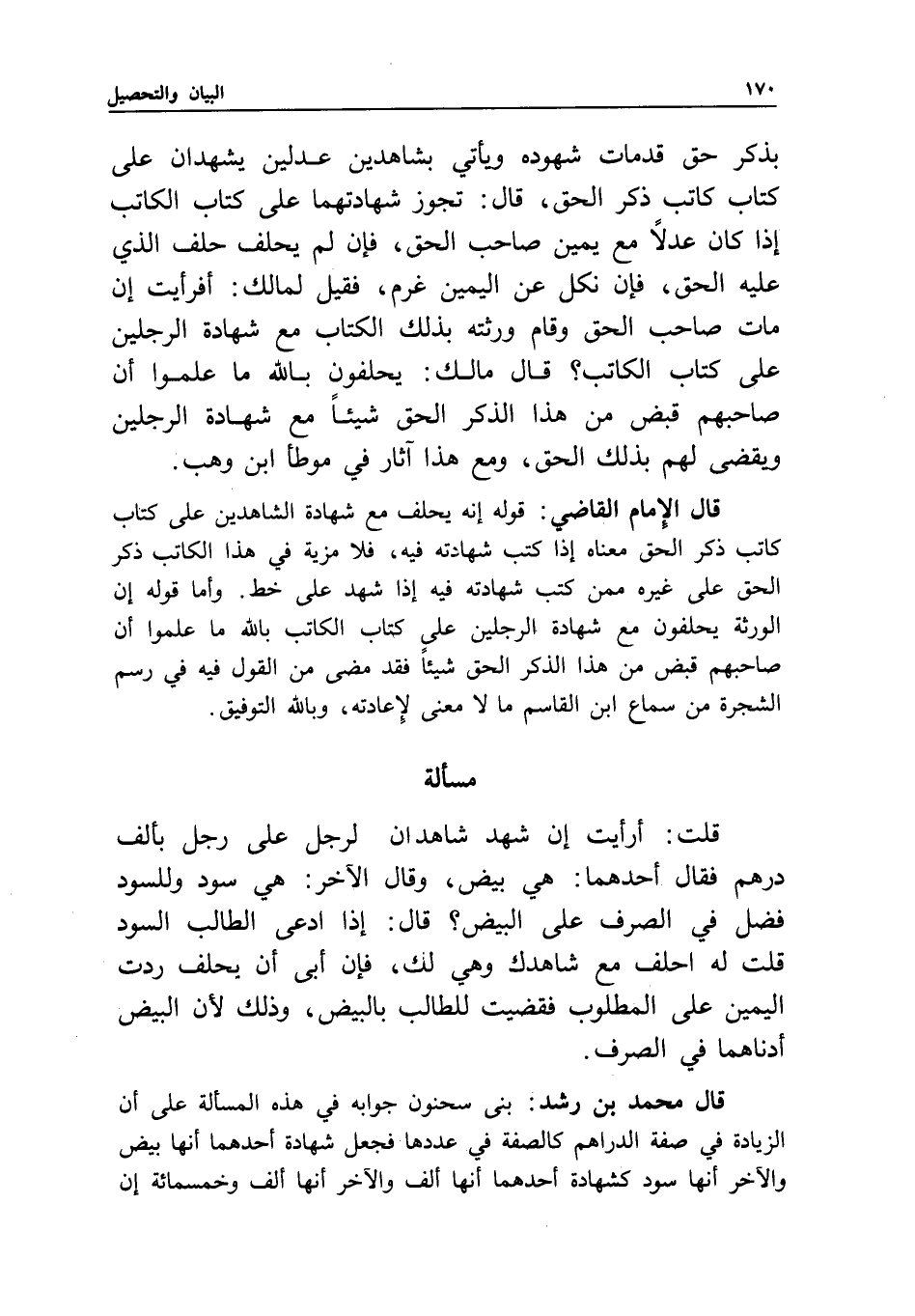 قال الإمام القاضي: قوله: إنه يحلف مع شهادة الشاهدين على كتاب كاتب ذكر الحق معناه إذا كتب شهادته فيه، فلا مزية في هذا الكاتب ذكر الحق على غيره ممن كتب شهادته فيه إذا شهد على خط، وأما قوله: إن الورثة يحلفون مع شهادة الرجلين على كتاب الكاتب بالله ما علموا أن صاحبهم قبض من هذا الذكر الحق شيئا، فقد مضى من القول فيه في رسم الشجرة، من سماع ابن القاسم، ما لا معنى لإعادته، وبالله التوفيق.