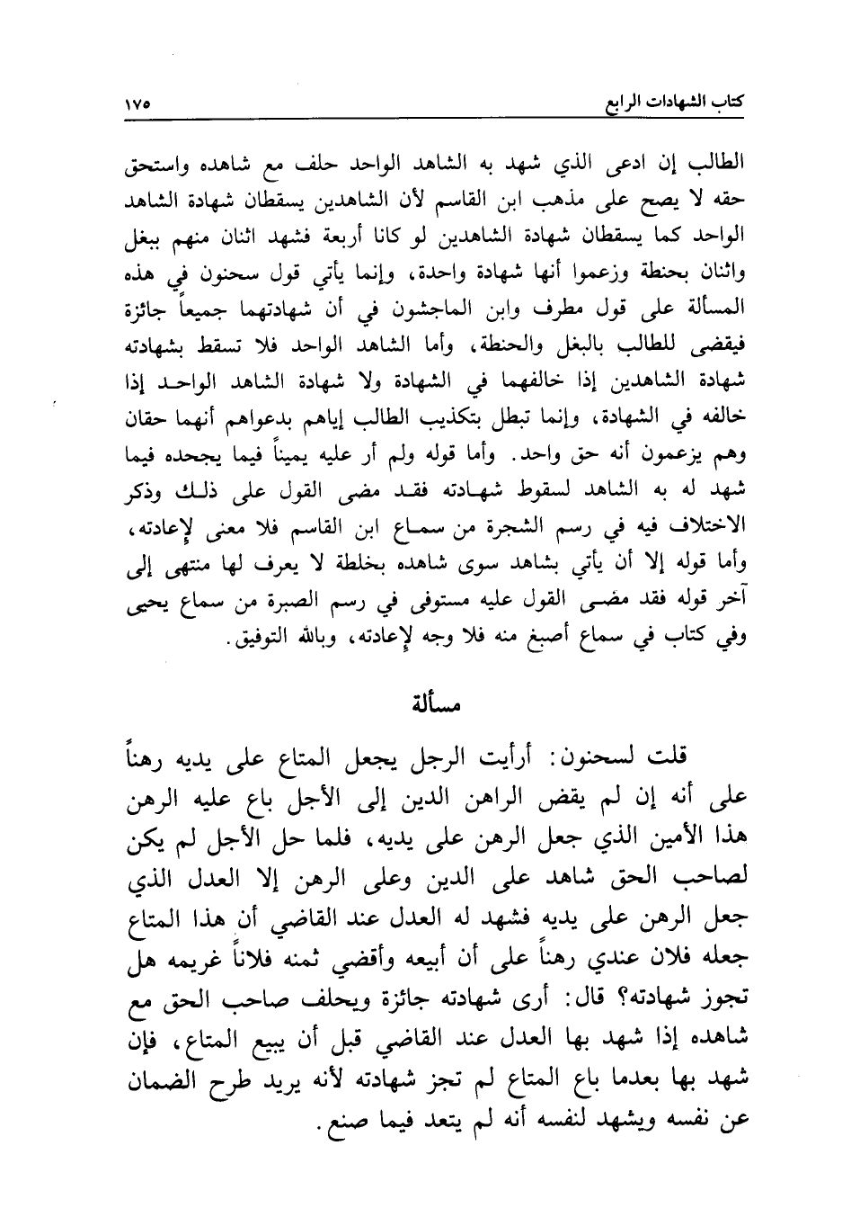 مسألة قلت لسحنون: أرأيت الرجل يجعل المتاع على يديه رهنا على أنه إن لم يقض الراهن الدين إلى الأجل باع عليه الرهن هذا الأمين الذي جعل الرهن على يديه، فلما حل الأجل لم يكن لصاحب الحق شاهد على الدين، وعلى الرهن إلا العدل الذي جعل الرهن على يديه، فشهد له العدل عند القاضي أن هذا المتاع جعله فلان عندي رهنا على أن أبيعه، وأقضي ثمنه فلانا غريمه، هل تجوز شهادته؟ قال: أرى شهادته جائزة، ويحلف صاحب الحق مع شاهده إذا شهد بها العدل عند القاضي قبل أن يبيع المتاع، فإن شهد بها بعدما باع المتاع لم تجز شهادته؛ لأنه يريد طرح الضمان عن نفسه، ويشهد لنفسه أنه لم يتعد فيما صنع.