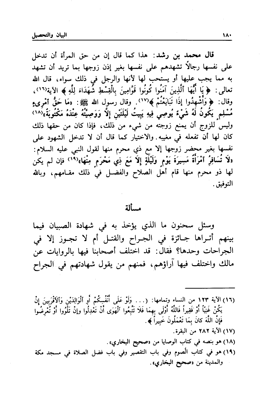 قال محمد بن رشد: هذا كما قال: إن من حق المرأة أن تدخل على نفسها رجالا تشهدهم على نفسها بغير إذن زوجها، بما تريد أن تشهد به مما يجب عليها، أو يستحب لها؛ لأنها والرجل في ذلك سواء، قال الله تعالى: {يَا أَيُّهَا الَّذِينَ آمَنُوا كُونُوا قَوَّامِينَ بِالْقِسْطِ شُهَدَاءَ لِلَّهِ} [النساء: 135] ، وقال: {وَأَشْهِدُوا إِذَا تَبَايَعْتُمْ} [البقرة: 282] ، وقال رسول الله - صَلَّى اللَّهُ عَلَيْهِ وَسَلَّمَ -: «ما حق امرئ مسلم يكون له شيء يوصي فيه يبيت ليلتين إلا ووصيته عنده مكتوبة» وليس للزوج أن يمنع زوجته من شيء من ذلك، فإذا كان من حقها ذلك كان لها أن تفعله في مغيبه، والاختيار كما قال: أن لا تدخل الشهود على نفسها بغير محضر زوجها، إلا مع ذي محرم منها؛ لقول النبي - عَلَيْهِ السَّلَامُ -: «لا تسافر امرأة مسيرة يوم وليلة، إلا مع ذي محرم منها» فإن لم يكن لها ذو محرم منها، قام أهل الصلاح والفضل في ذلك مقامهم، وبالله التوفيق.