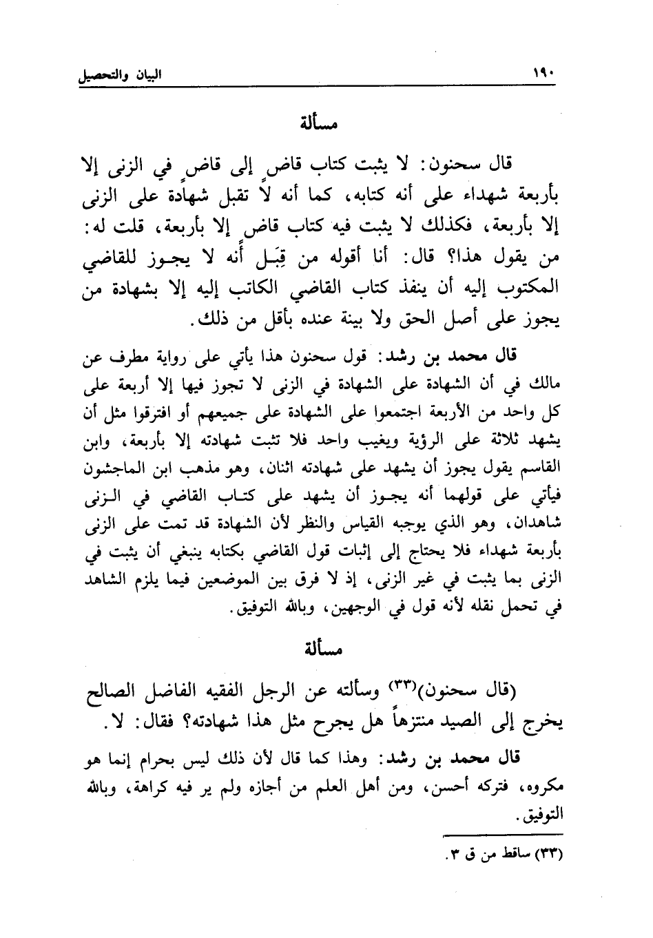 مسألة قال سحنون: لا يثبت كتاب قاض إلى قاض في الزنا إلا بأربعة شهداء على أنه كتابه، كما أنه لا تقبل شهادة على الزنا إلا بأربعة، فكذلك لا يثبت فيه كتاب قاض إلا بأربعة، قلت له: من يقول هذا؟ قال: أنا أقوله من قبل أنه لا يجوز للقاضي المكتوب إليه أن ينفذ كتاب القاضي الكاتب إليه إلا بشهادة من يجوز على أصل الحق، ولا بينة عنده بأقل من ذلك.